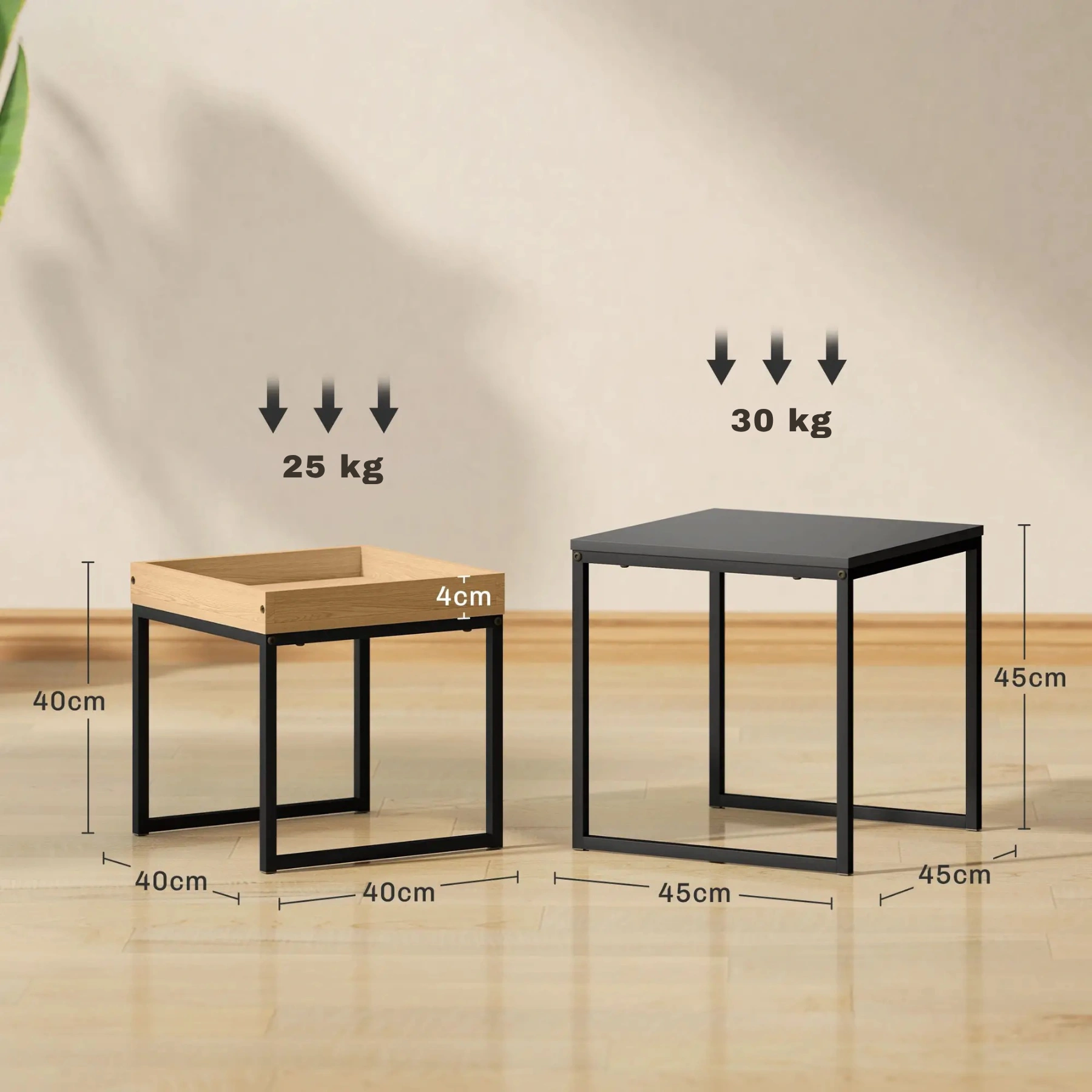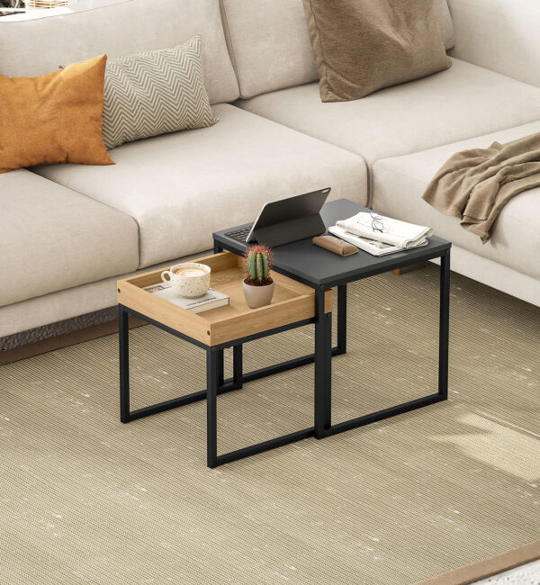 Ge ditt vardagsrum ett lyft med vårt fina och praktiska sidobordset. Setet består av ett större bord med svart yta och ett mindre bord med laminerad träskiva – använd dem separat eller tillsammans för att passa din inredning. De moderna borden har stabila U-formade ben och ger en stilren, samtida känsla till rummet.