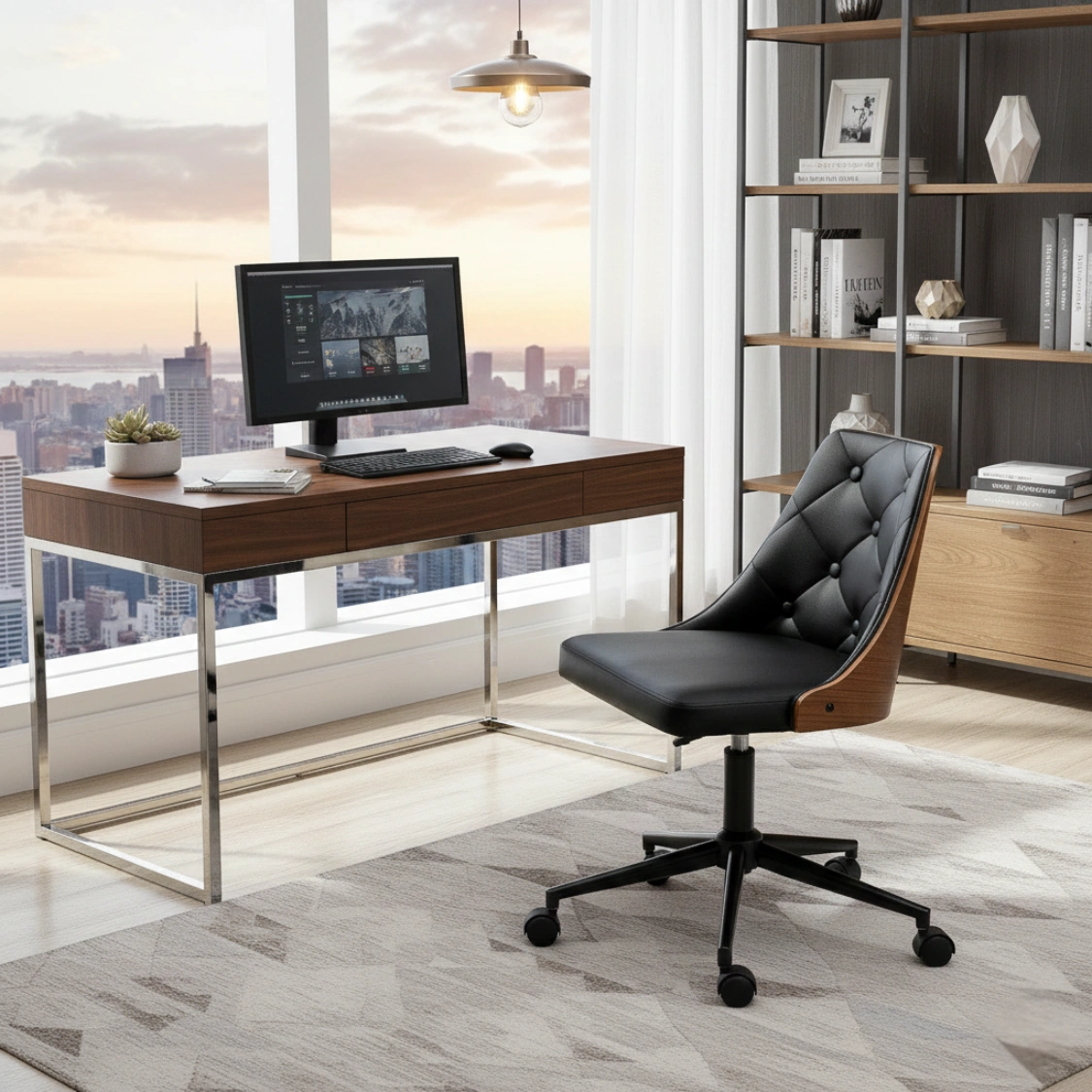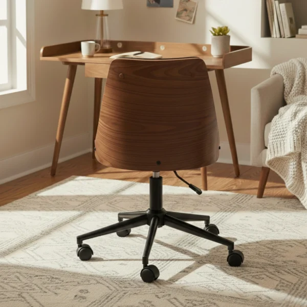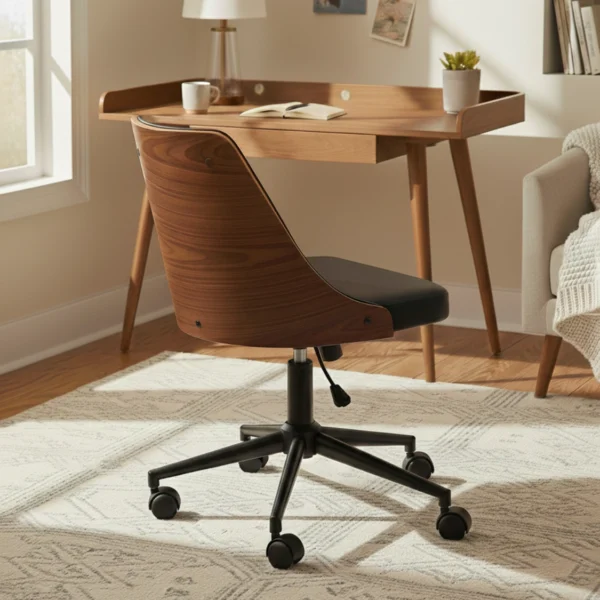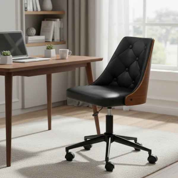 Ergonomisk Skrivbordsstol i Retrodesign – Trä och Läder – Svart och Valnötsbrun