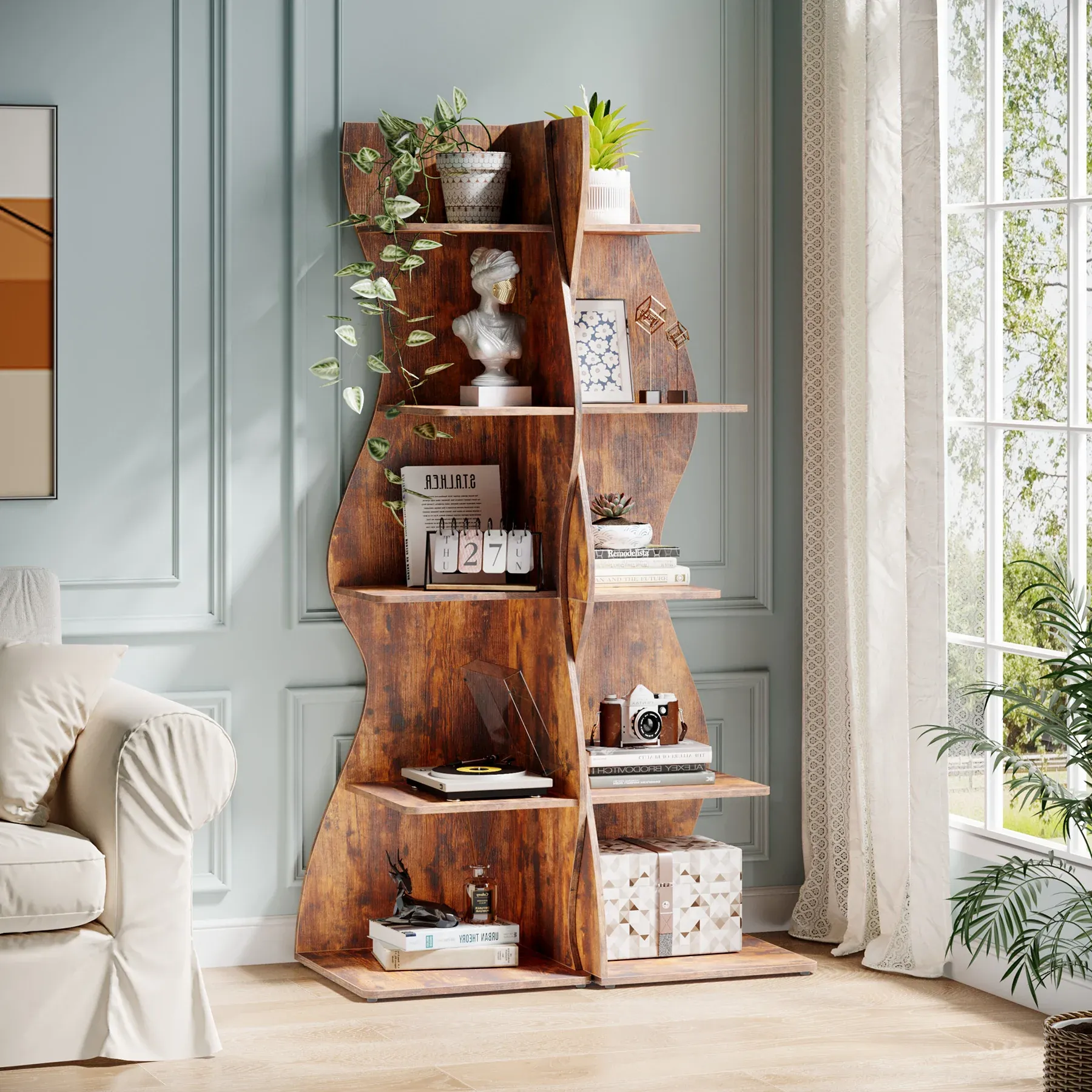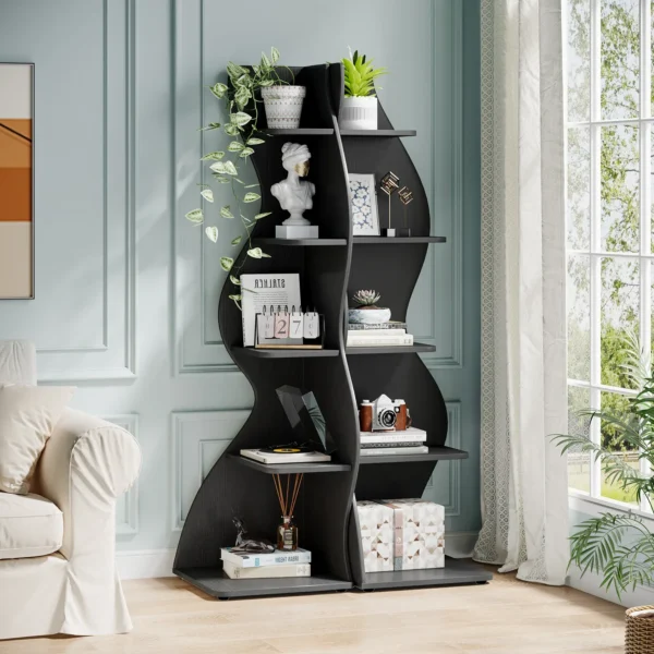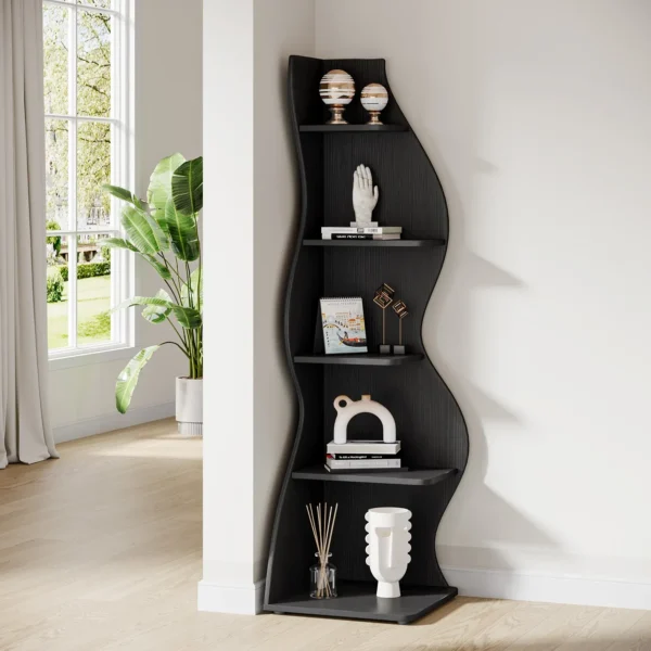 - Chic 5-plans förvaringslösning: Denna eleganta hylla kombinerar modern funktionalitet med vintagekänsla genom sin unika form. Designen skapar ett iögonfallande intryck samtidigt som den erbjuder praktisk förvaring.