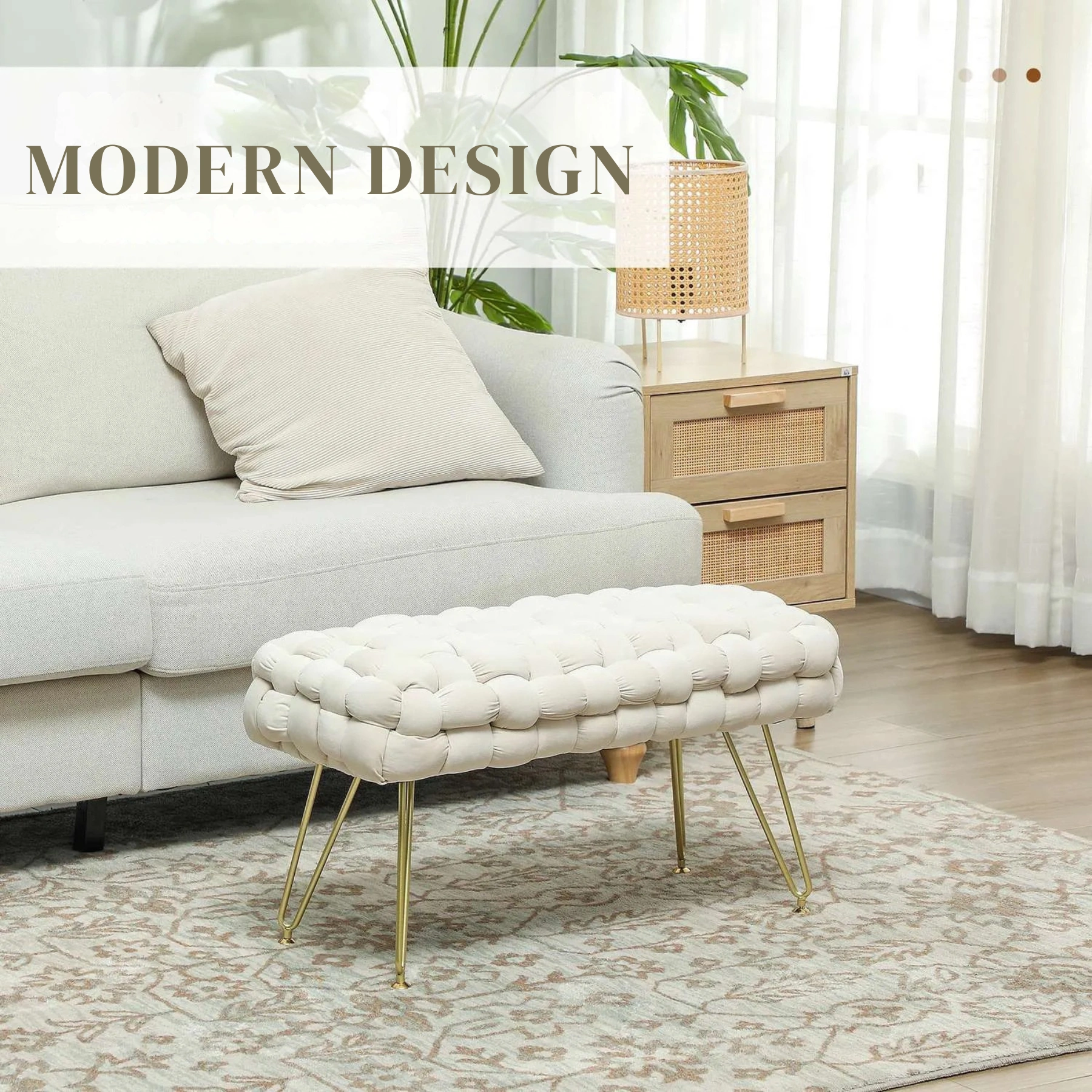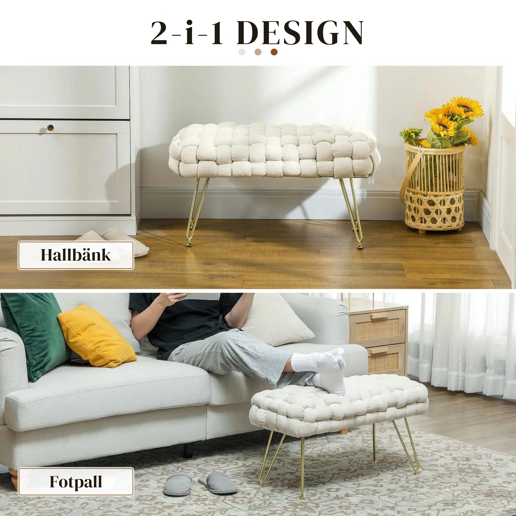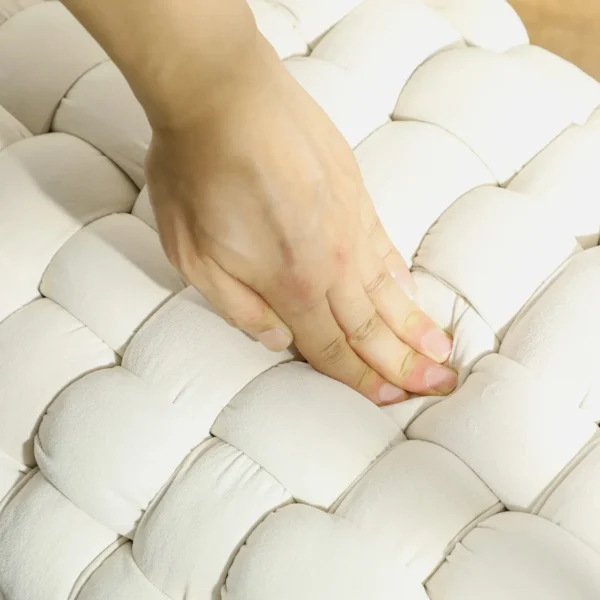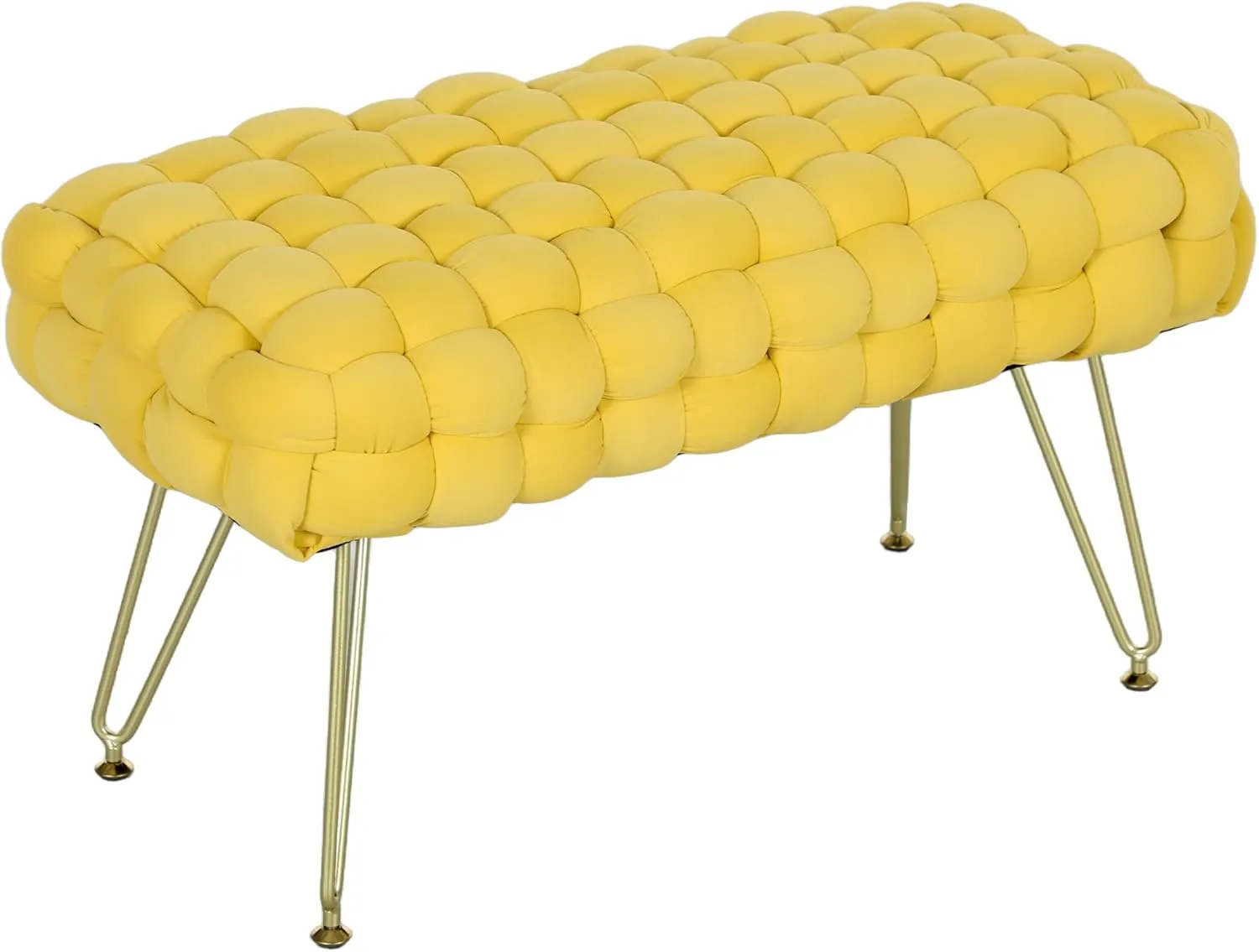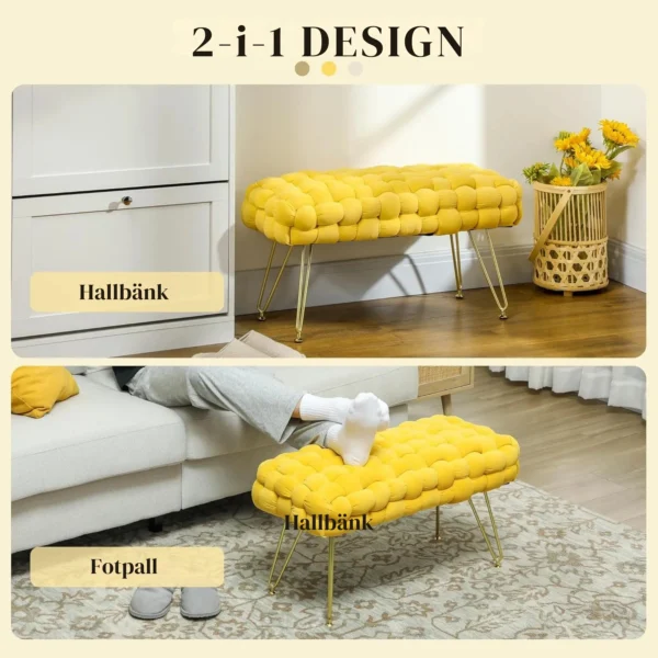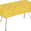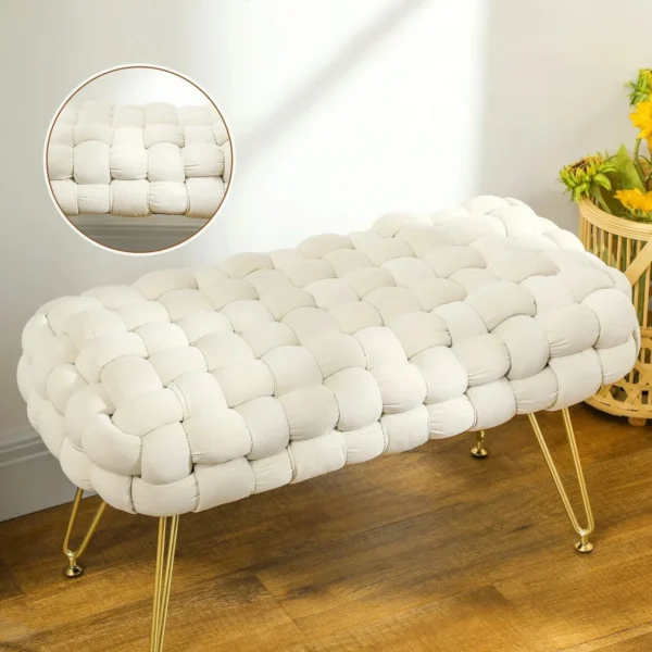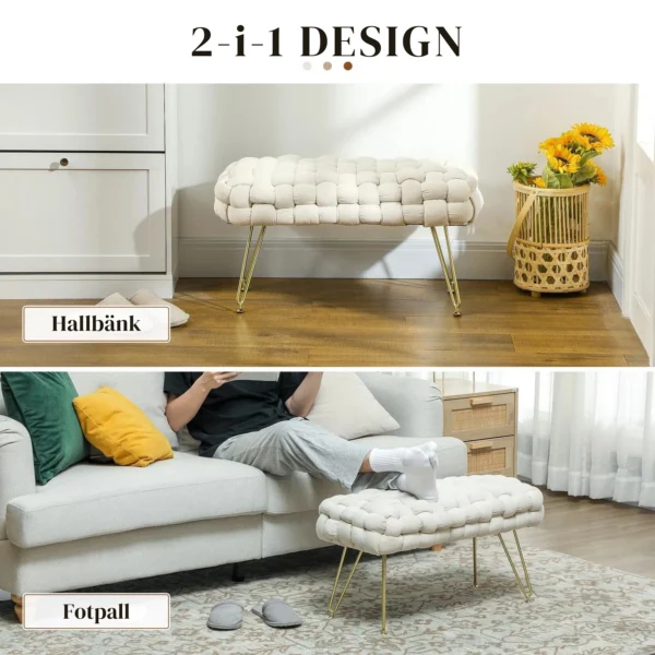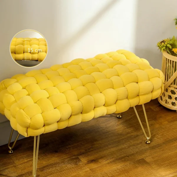 Den moderna designen med flätat tyg i sammetsfinish och metallben ger en sofistikerad känsla till alla rum. Använd den som sittplats vid sminkbordet, som fotpall eller som extra sittplats i vardagsrummet – ett mångsidigt och stilrent tillskott som passar alla inredningsstilar.