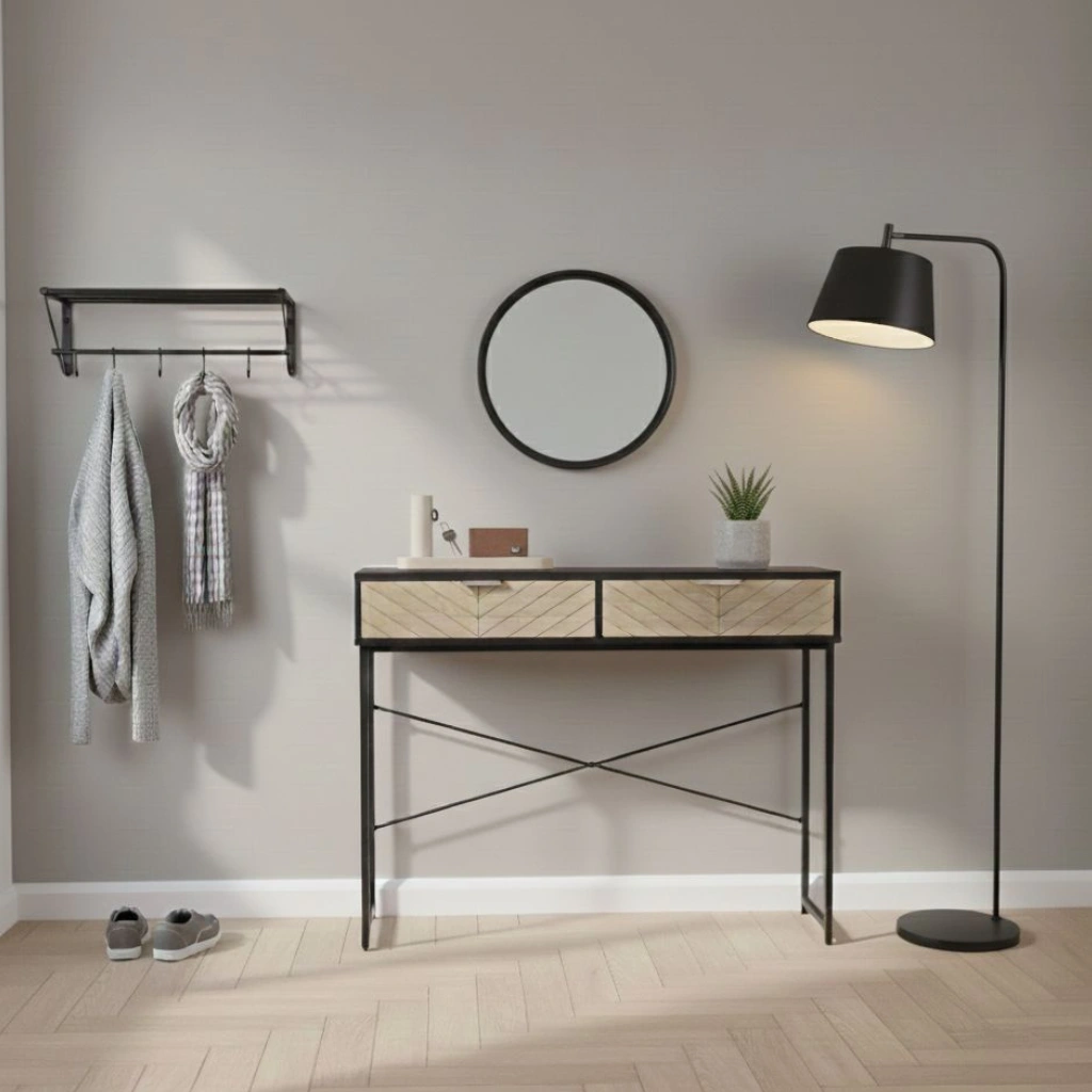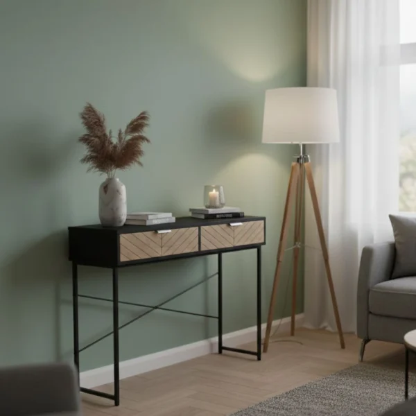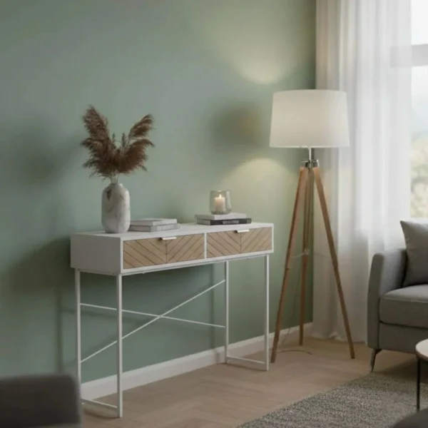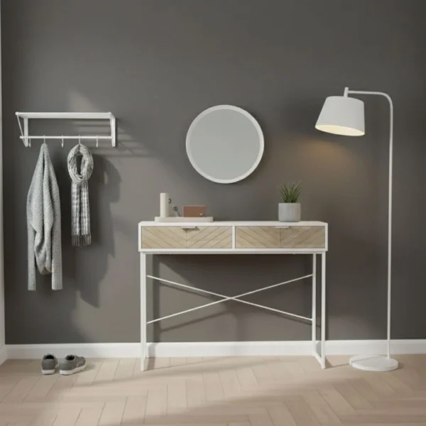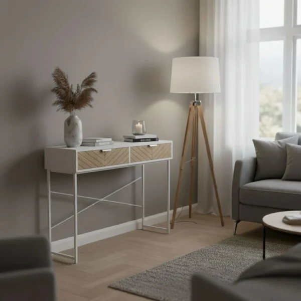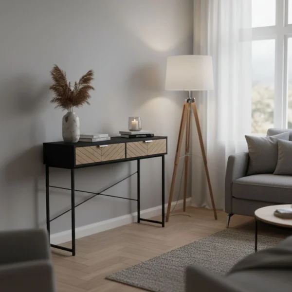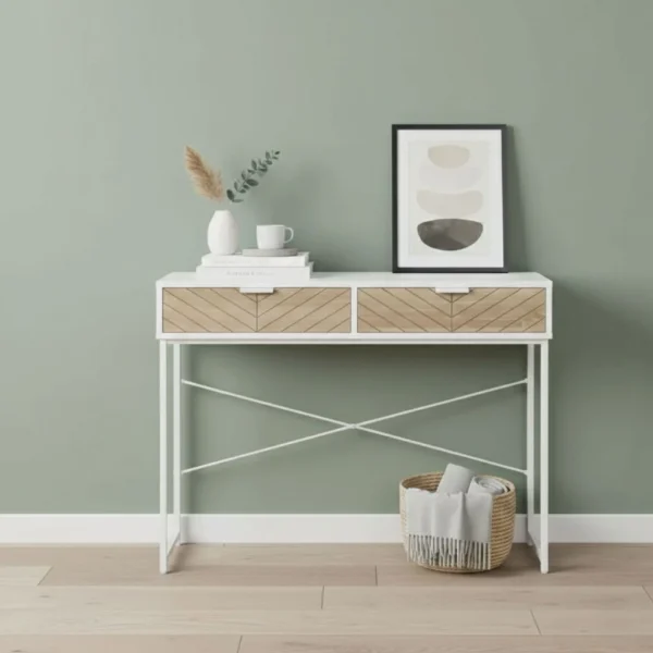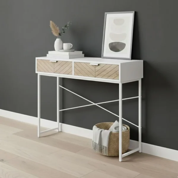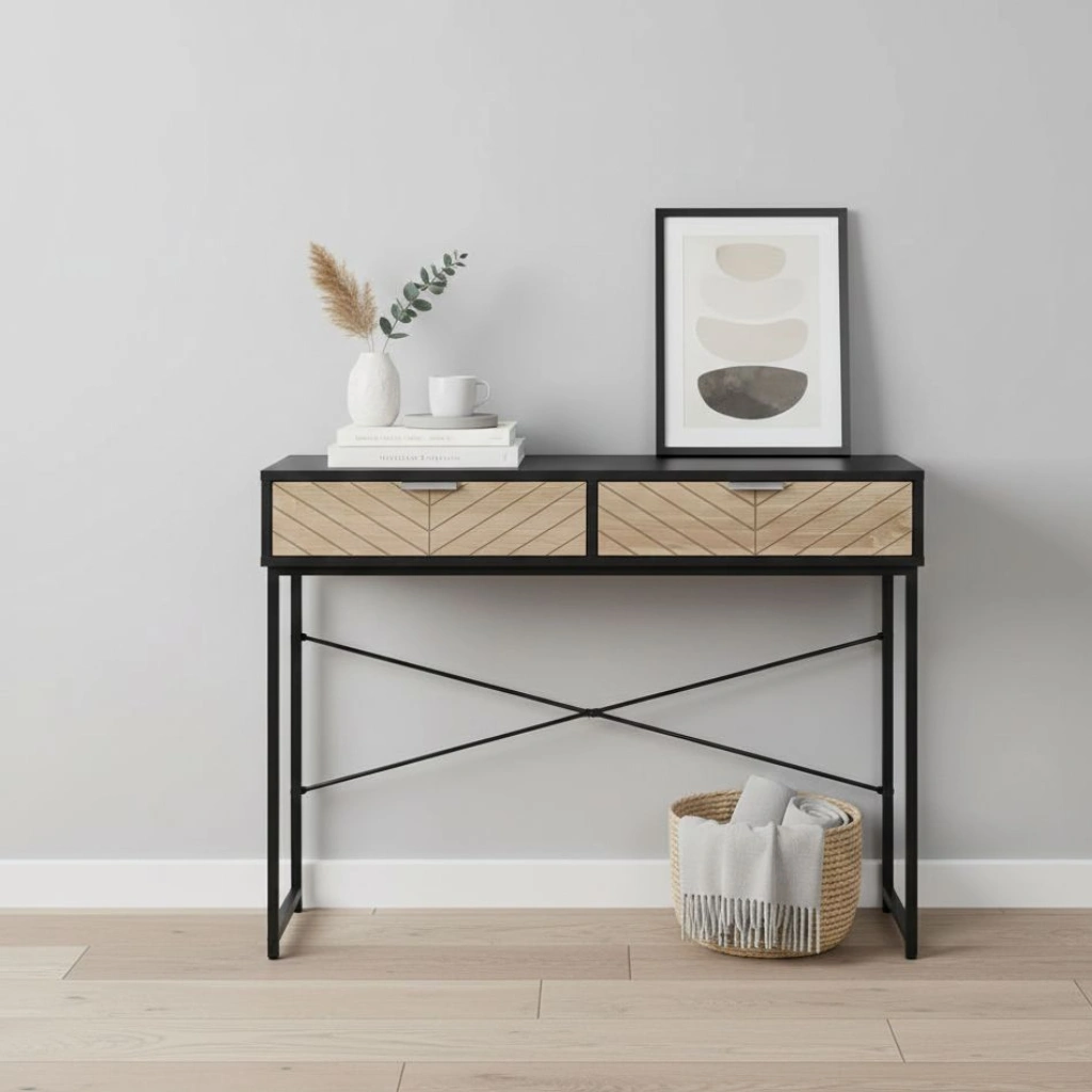 Med två lådor och en generös bordsskiva får du gott om plats för böcker, foton och dekorationer. Den robusta konstruktionen i melamin och metall, kompletterad med x-formad förstärkning på baksidan, ger både stabilitet och hållbarhet. Passar lika bra i hallen som i vardagsrummet, sovrummet eller på kontoret – ett oumbärligt tillskott till ditt hem.