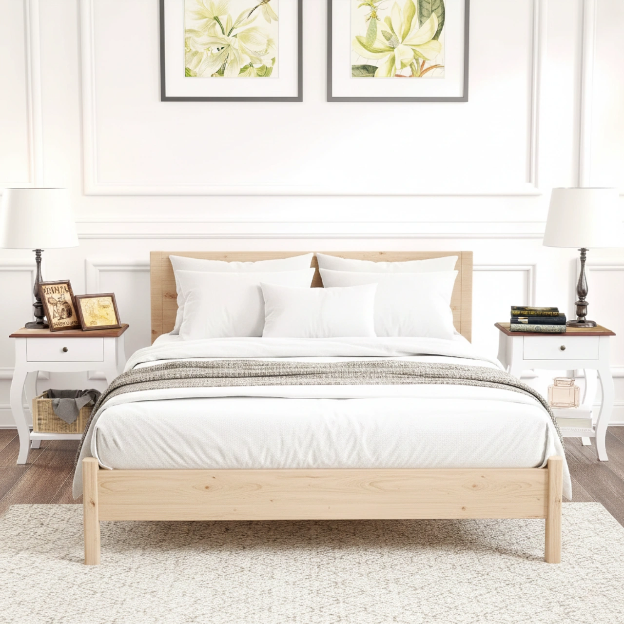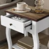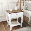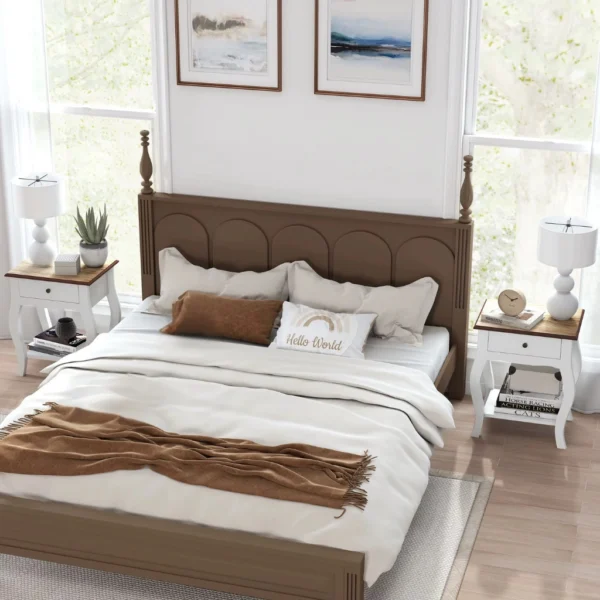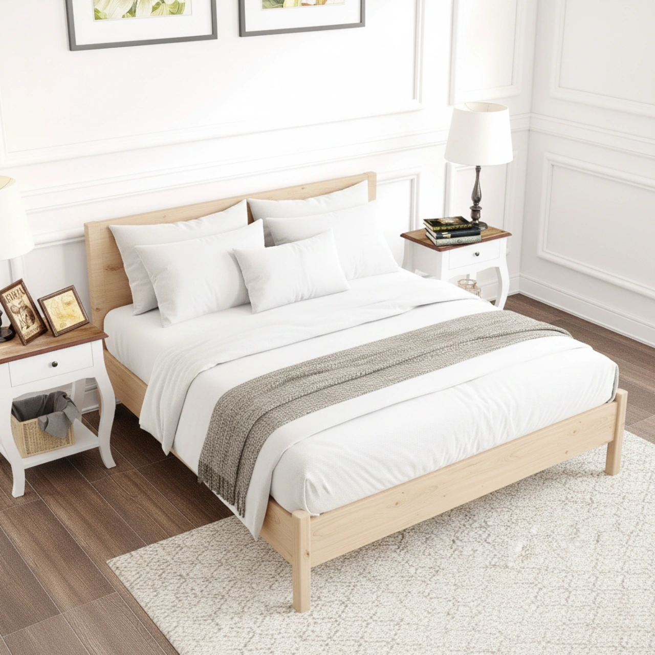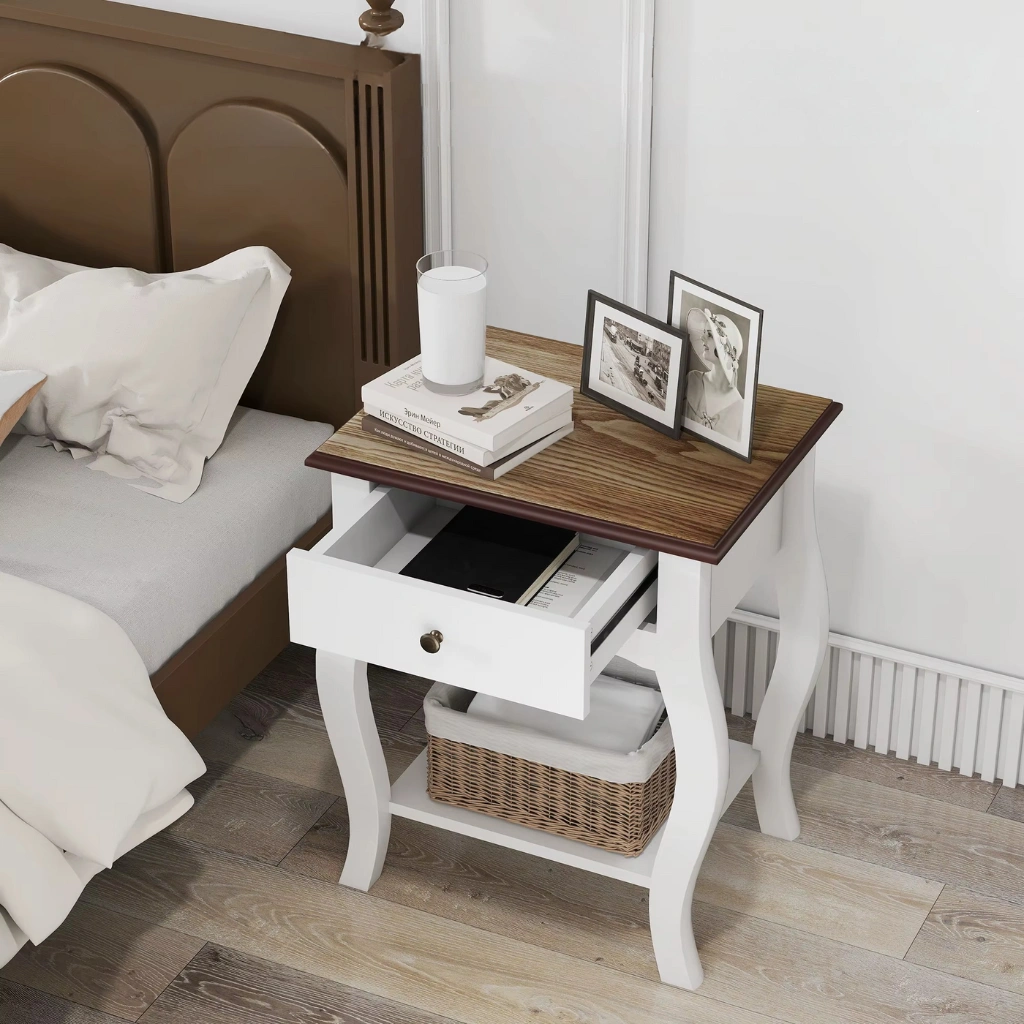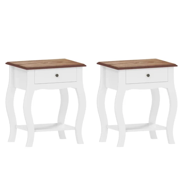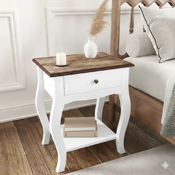 Skapa ett lugnt och harmoniskt sovrum med detta set om två nattduksbord i tidlös fransk design. Den vita basen kombinerad med en varm ek-tonad bordsskiva ger ett ljust, elegant uttryck som passar perfekt i skandinaviska hem.