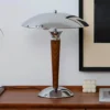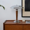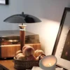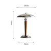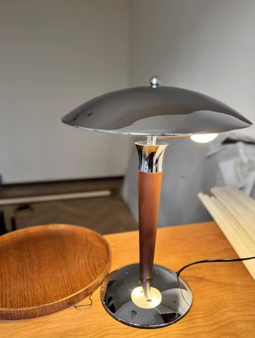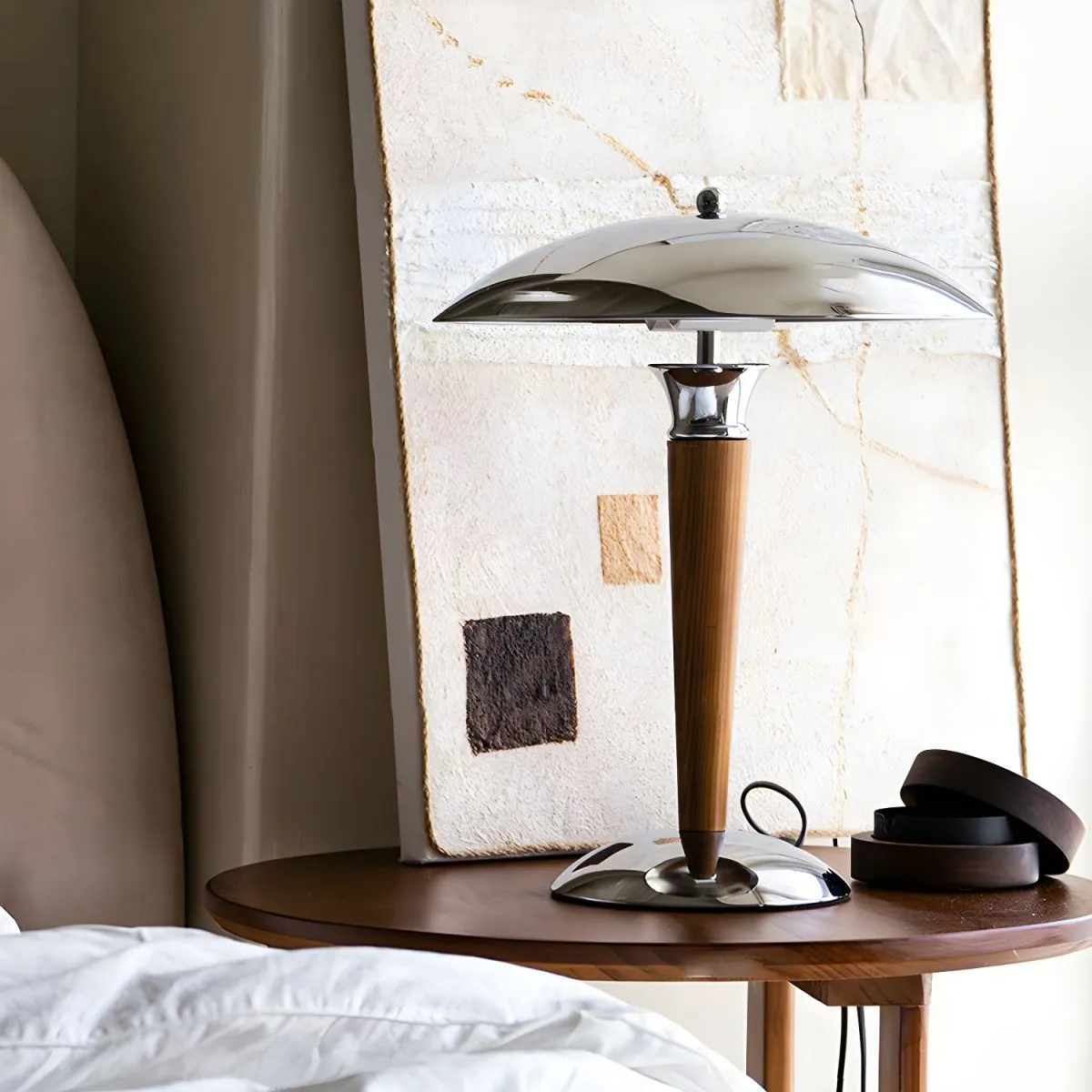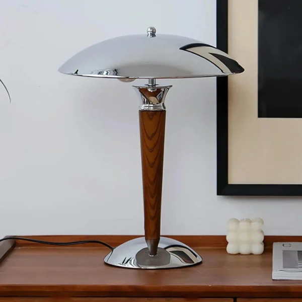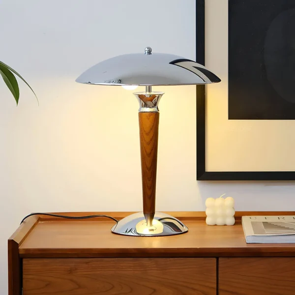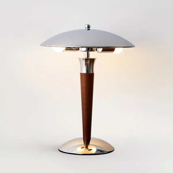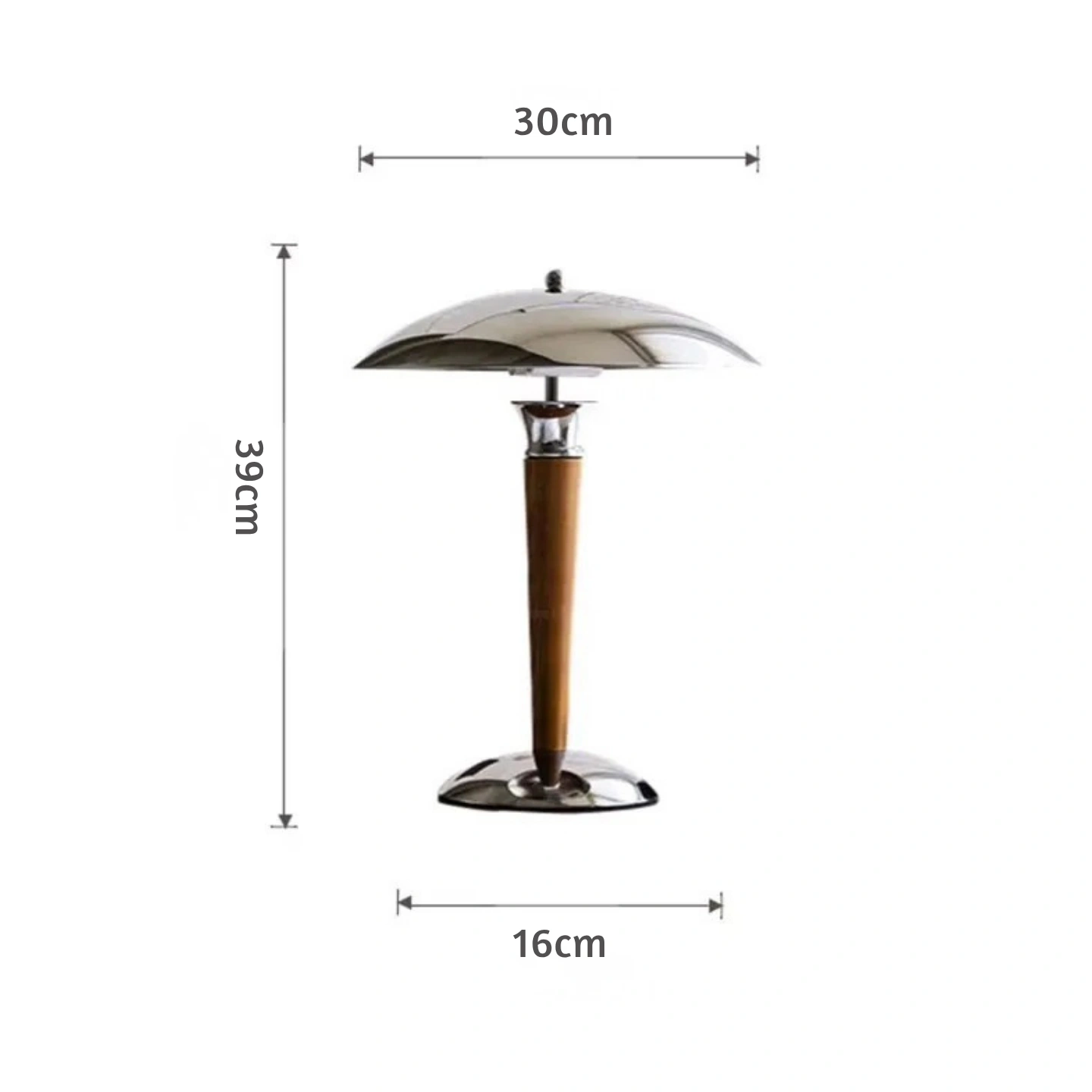 En elegant bordslampa i modern retrostil som kombinerar trä och metall för en tidlös känsla. Den rundade lampskärmen och den smala träfoten ger lampan ett exklusivt uttryck som passar lika bra i sovrummet som i vardagsrummet eller på skrivbordet.