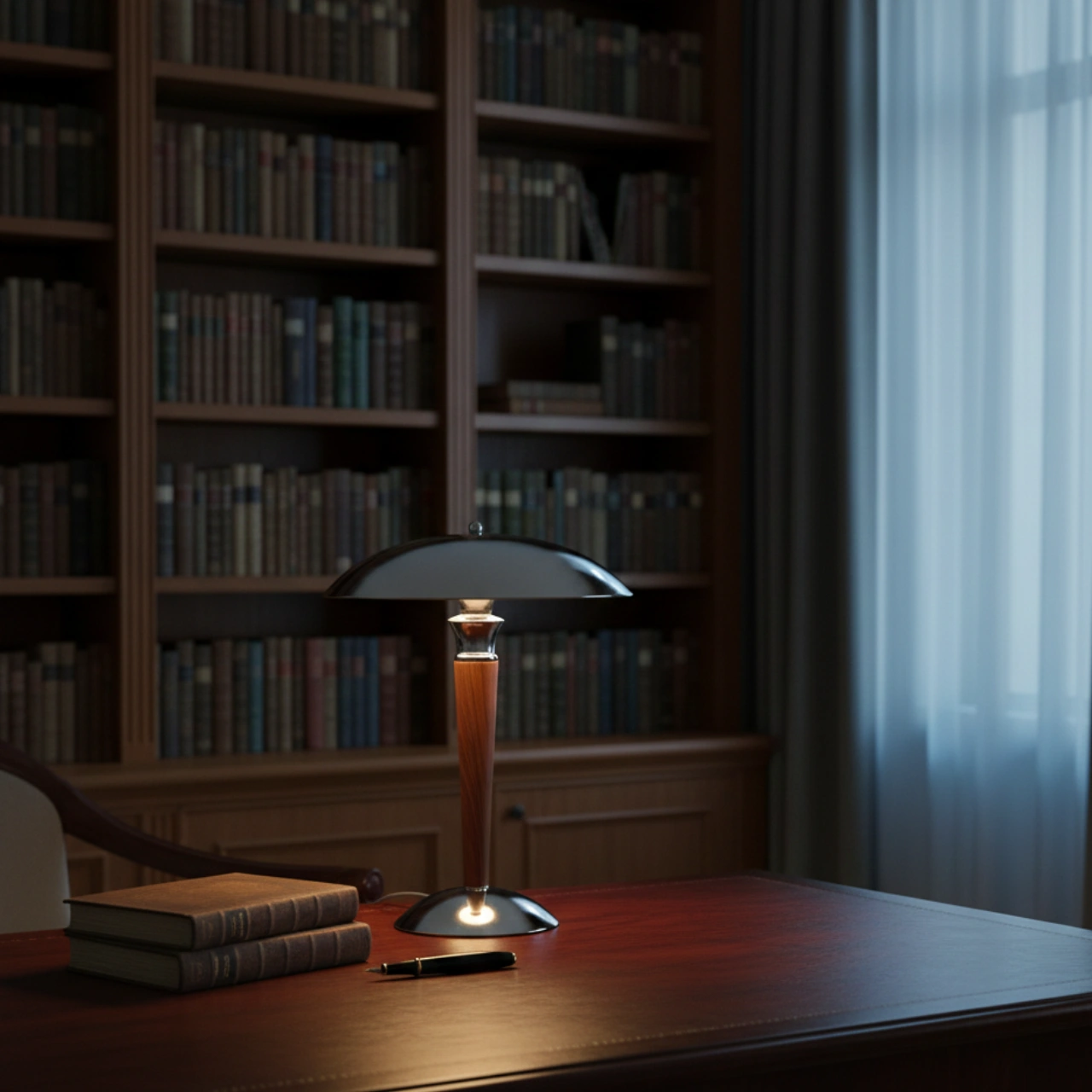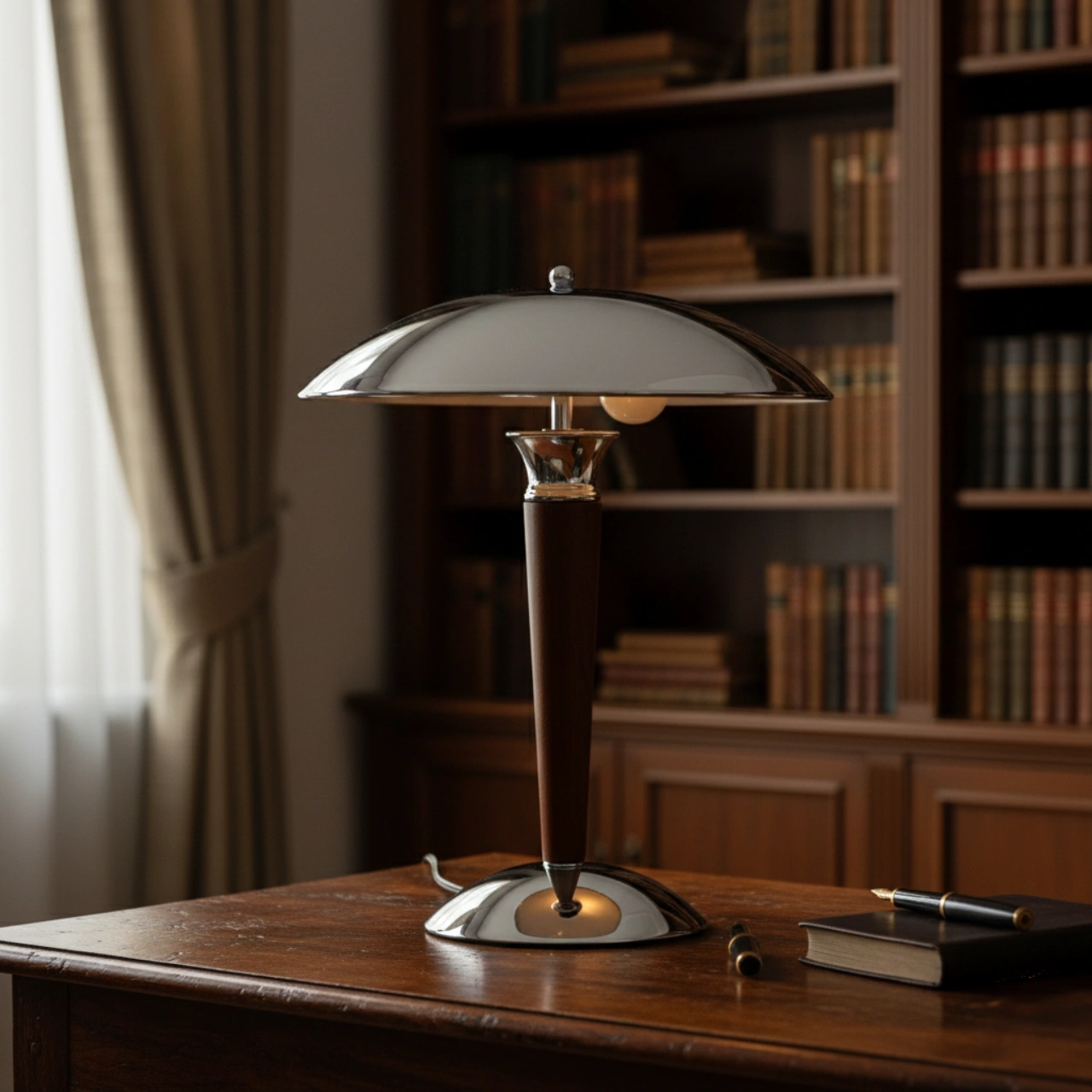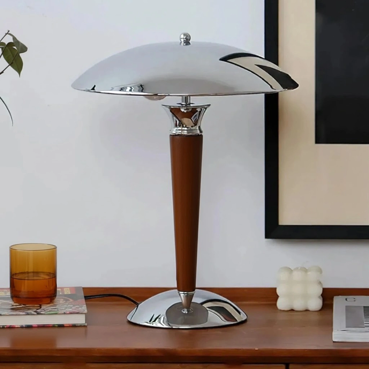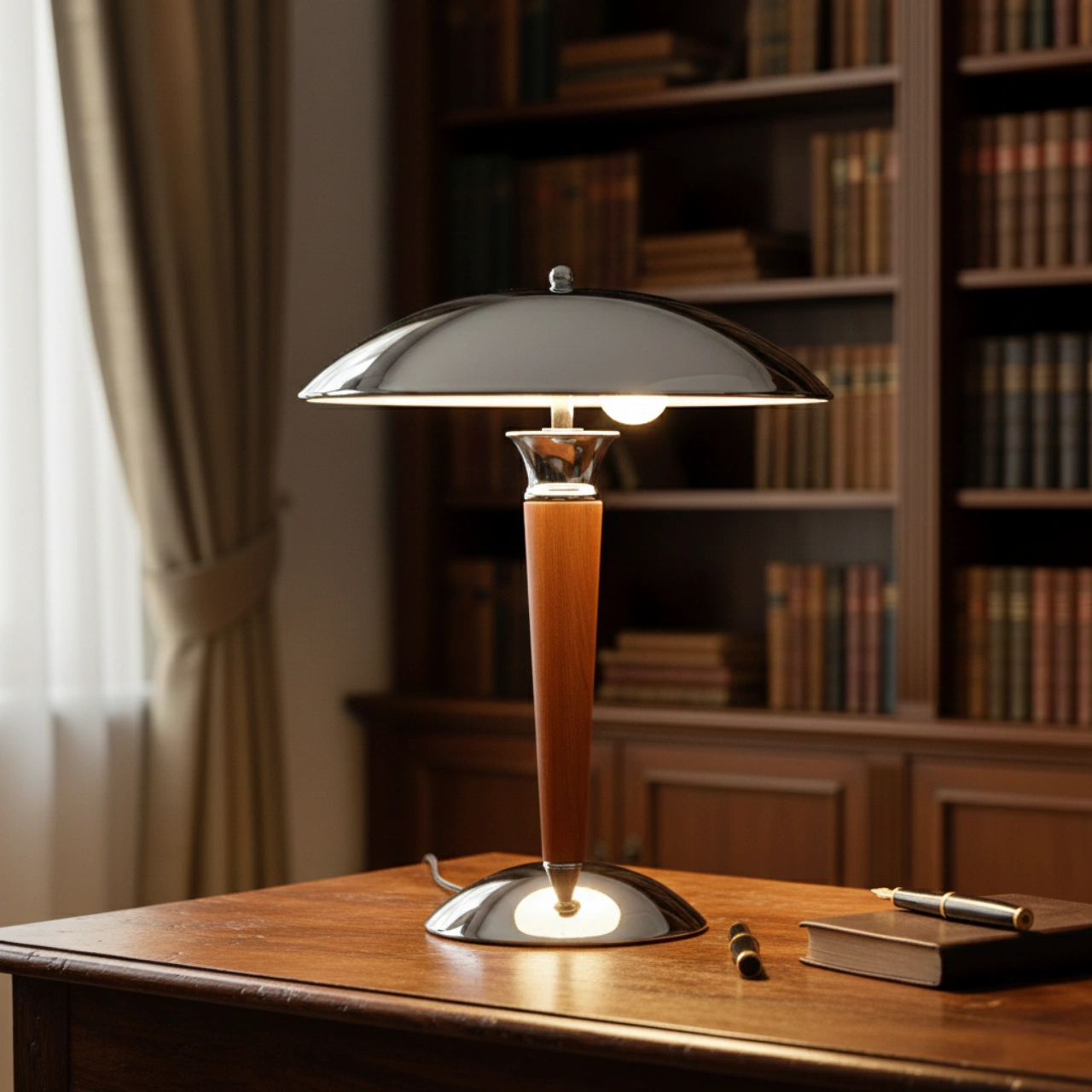 En elegant bordslampa i modern retrostil som kombinerar trä och metall för en tidlös känsla. Den rundade lampskärmen och den smala träfoten ger lampan ett exklusivt uttryck som passar lika bra i sovrummet som i vardagsrummet eller på skrivbordet.