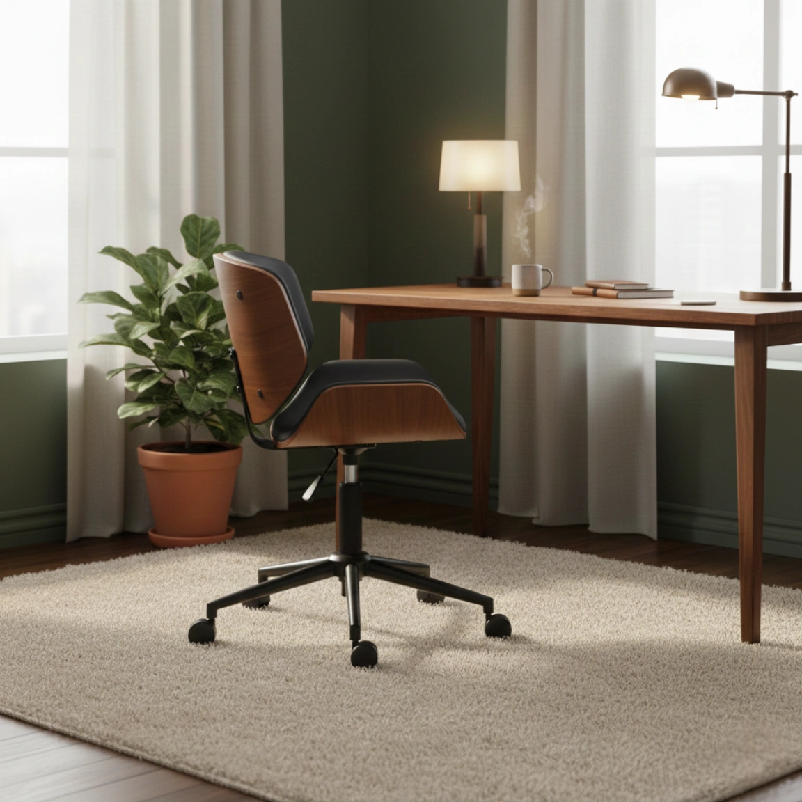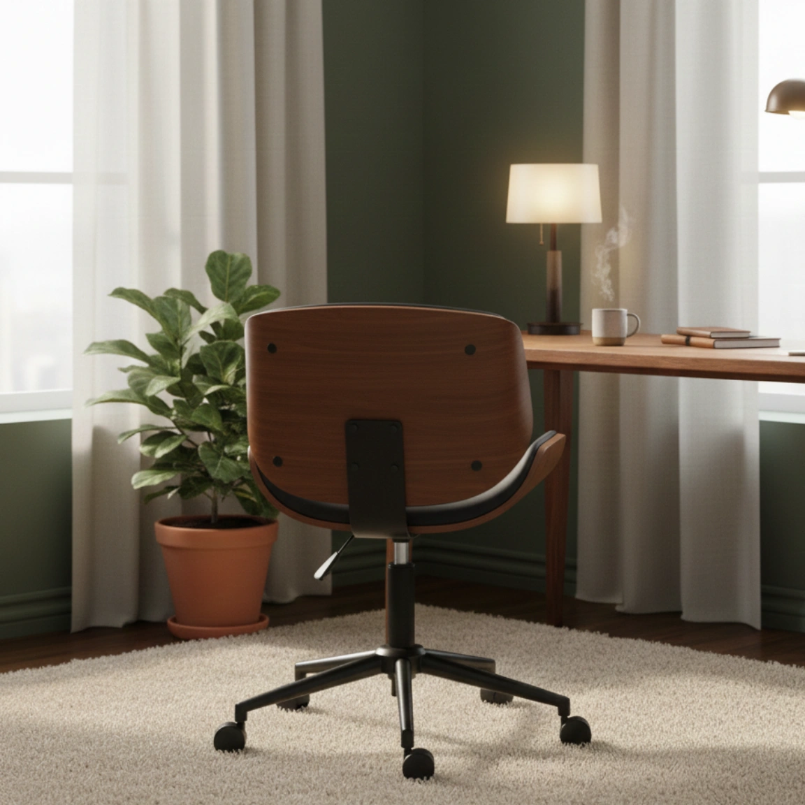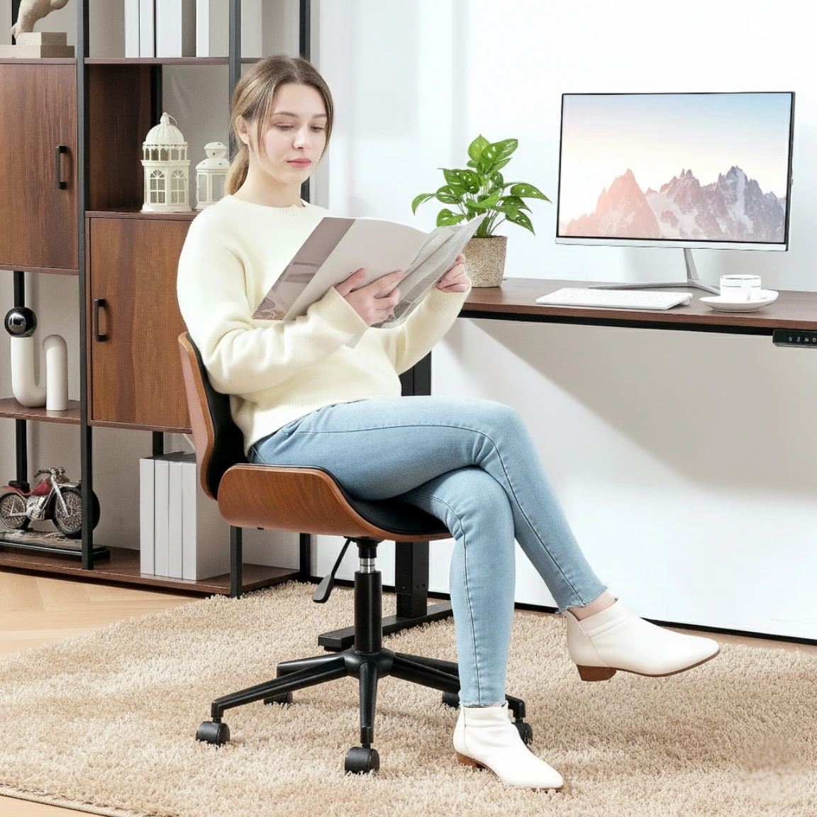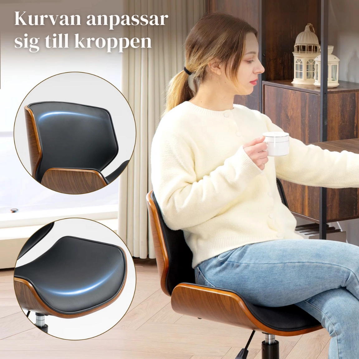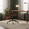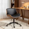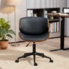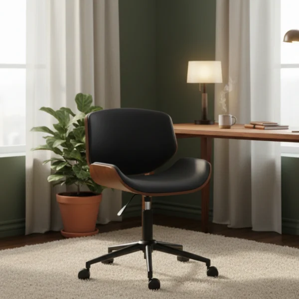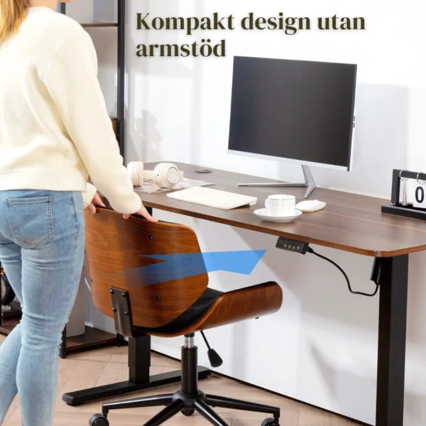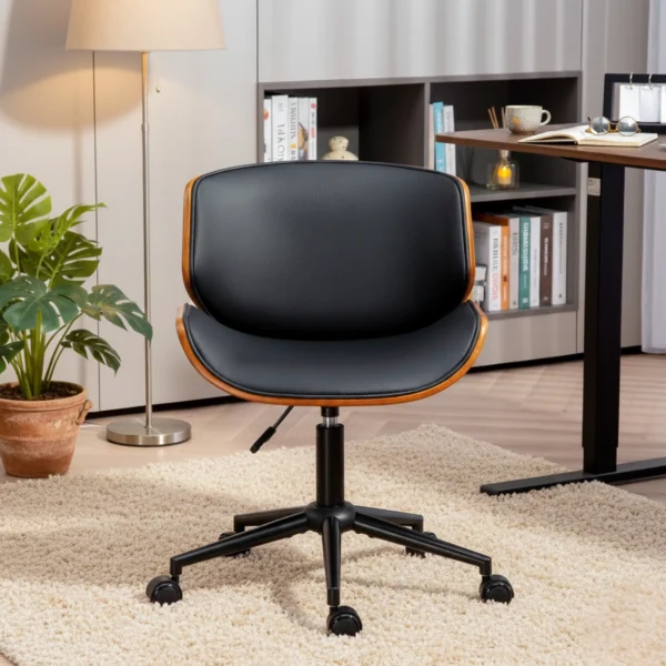 Denna armlösa kontorsstol kombinerar böjt trä och syntetläder för att ge ditt rum ett modernt och ombonat utseende. Stolen är platsbesparande, bekväm och lätt att flytta – perfekt för långa timmar framför datorn.