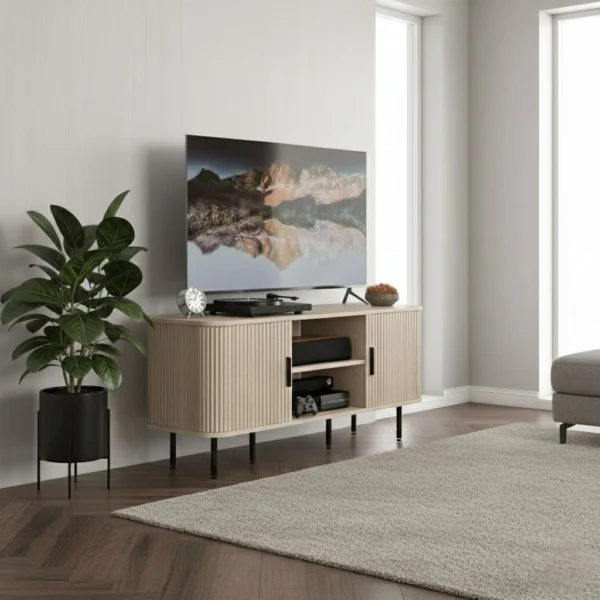 Retro Vintage TV-bänk med Skjutdörrar i Ekfinish – 120 cm