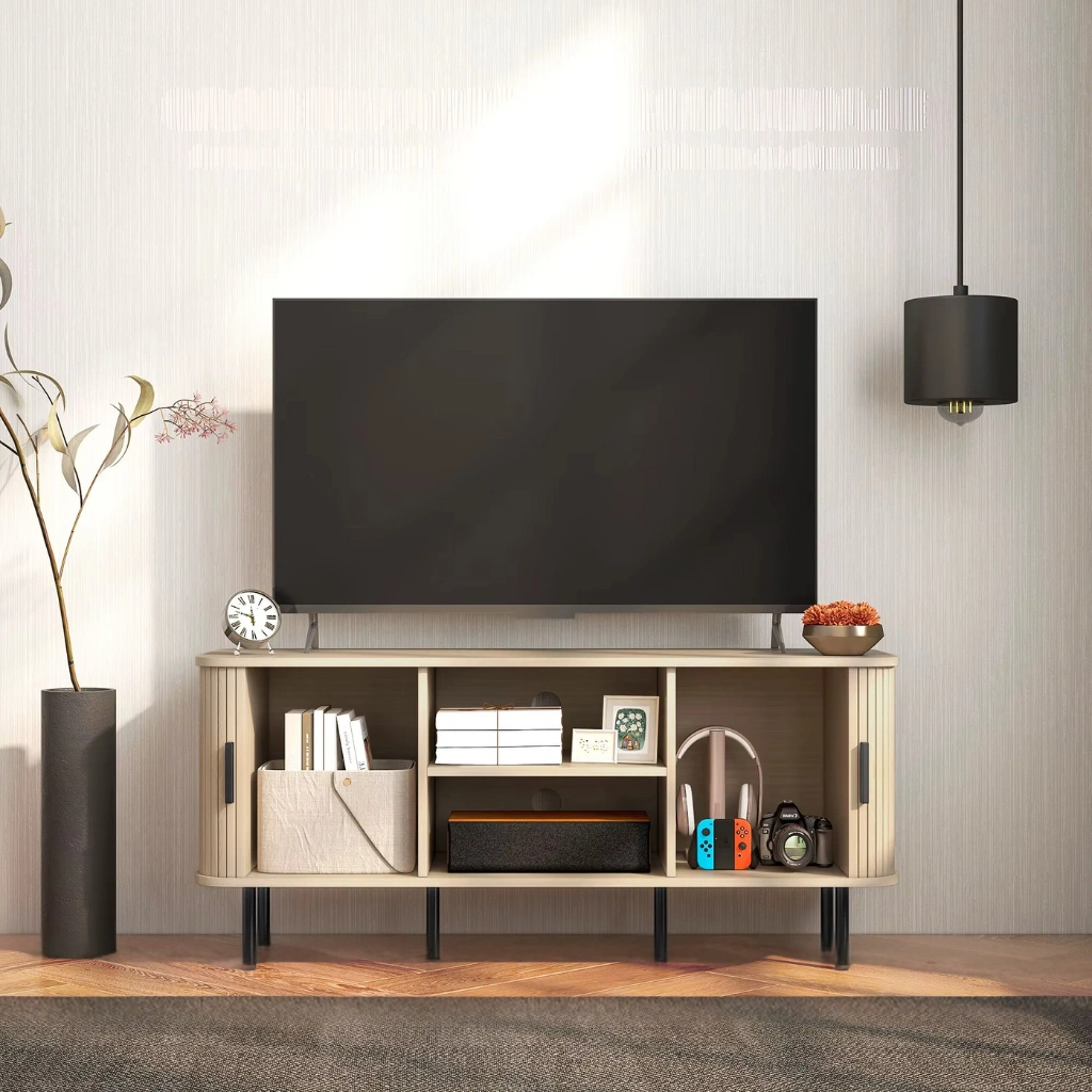 • Denna TV-bänk med skjutdörrar har en unik och dekorativ design