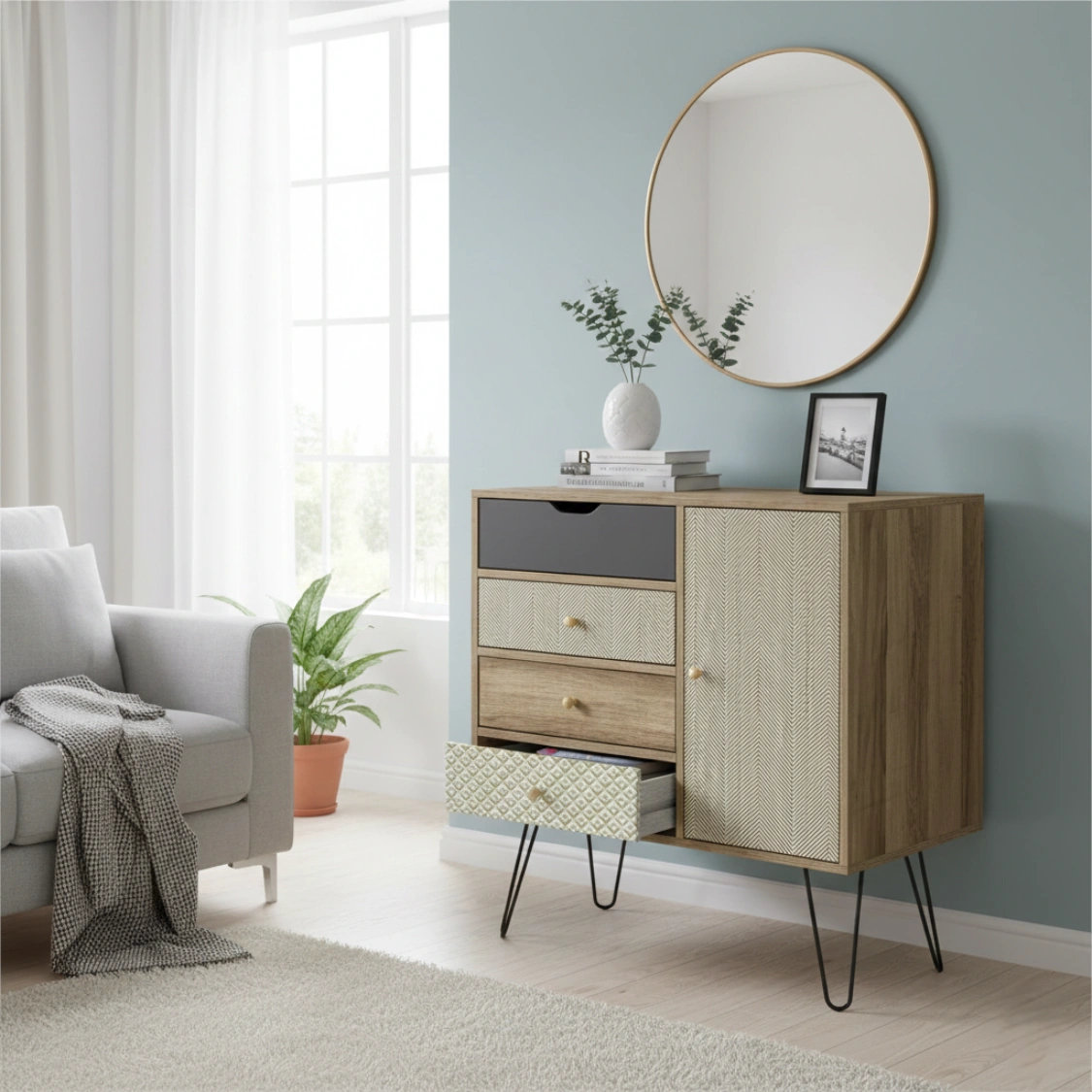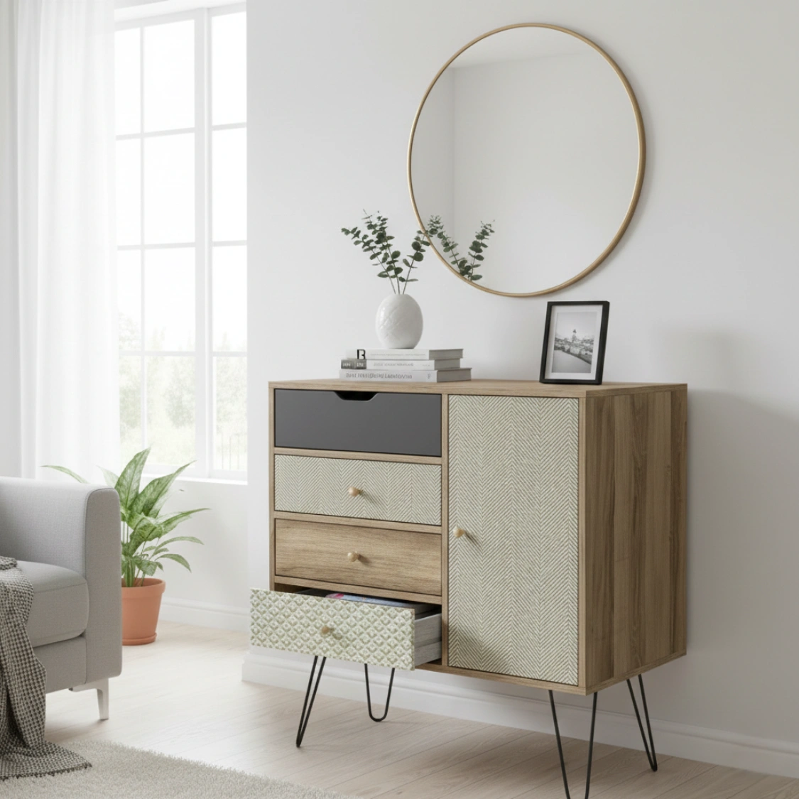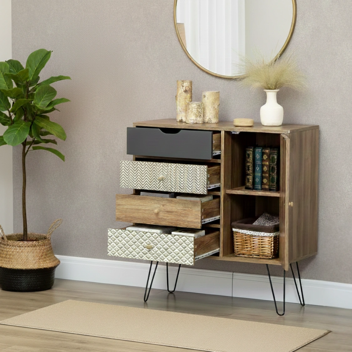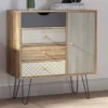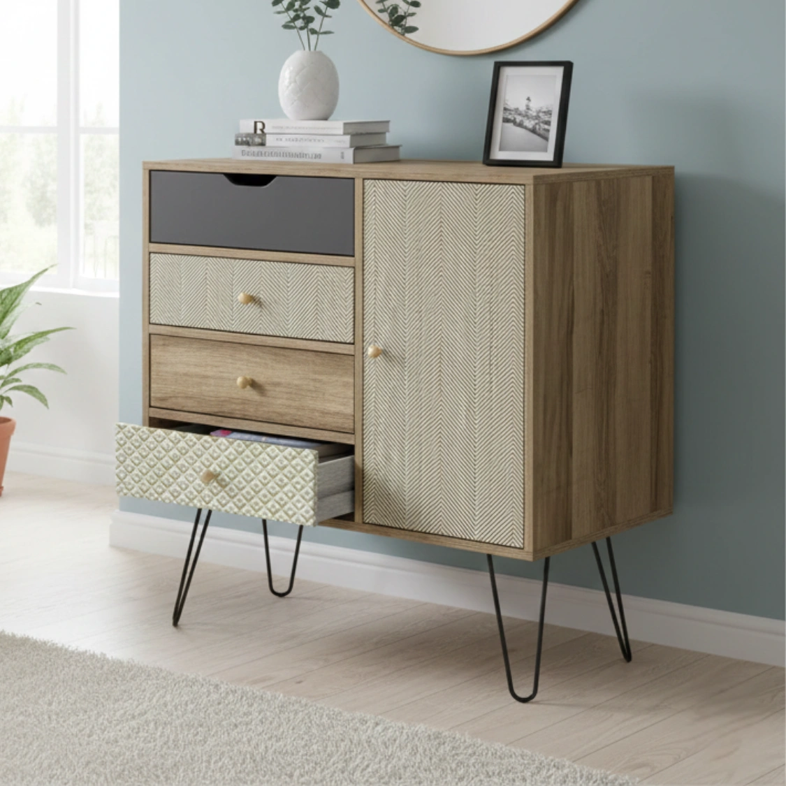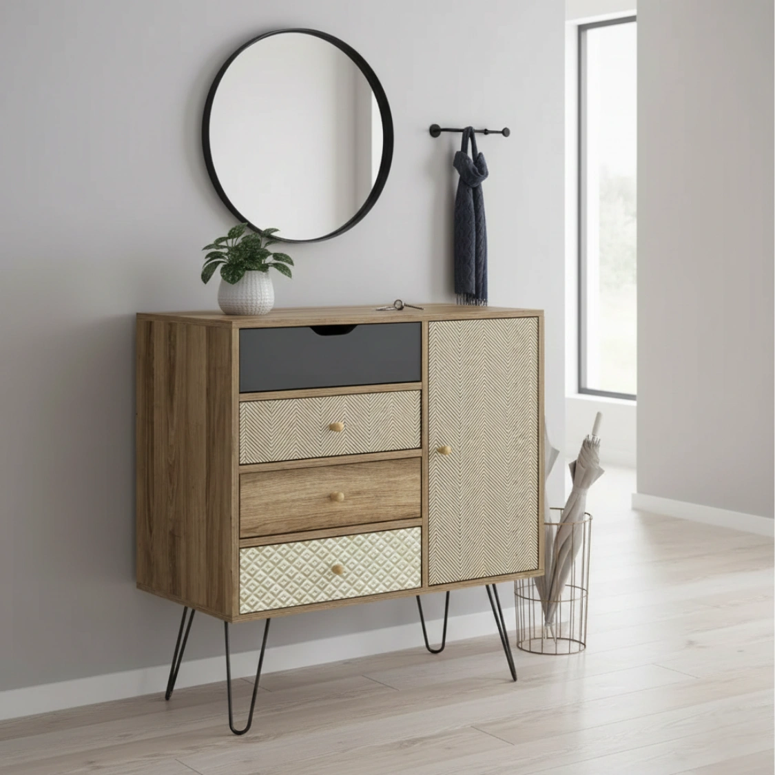 Letar du efter en möbel som sticker ut från mängden? Denna eleganta byrå kombinerar bohemisk charm med modern industriell design. Med sina mönstrade lådfronter och stilrena hairpin-ben (hårnålsben) i metall blir den ett blickfång i allt från hallen till vardagsrummet eller sovrummet.