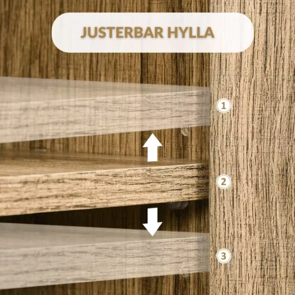 • Hållbara Material: Tillverkad i slitstark och lättskött melamin som enkelt torkas av med en fuktig trasa.