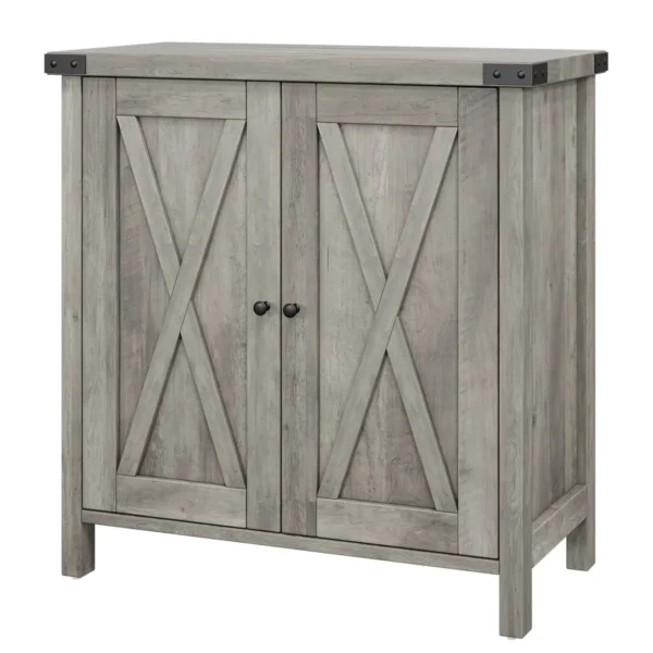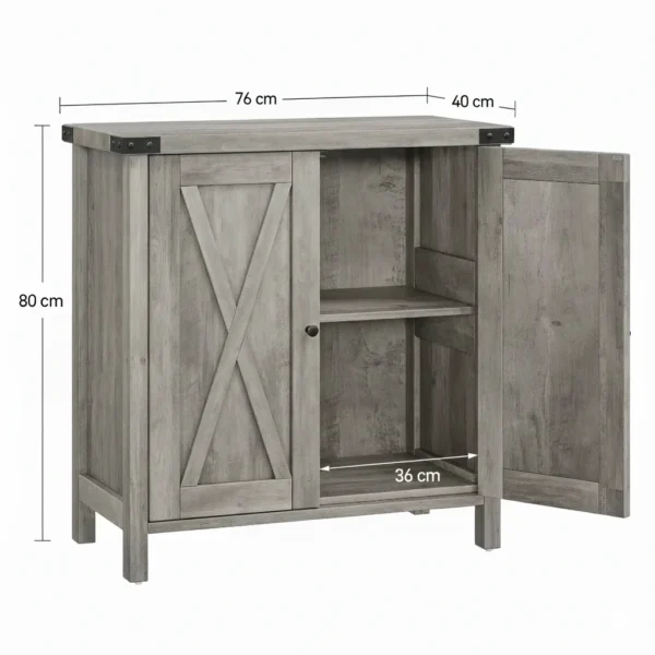 Denna stilrena skänk kombinerar praktisk förvaring med en rustik design som skapar ett varmt och inbjudande intryck. Med sin kompakta storlek och funktionella utformning passar den lika bra i vardagsrum, hall som i kök. Den grå trälooken tillsammans med de dekorativa X-dörrarna ger möbeln ett tidlöst uttryck som smälter in i både moderna och klassiska hem.