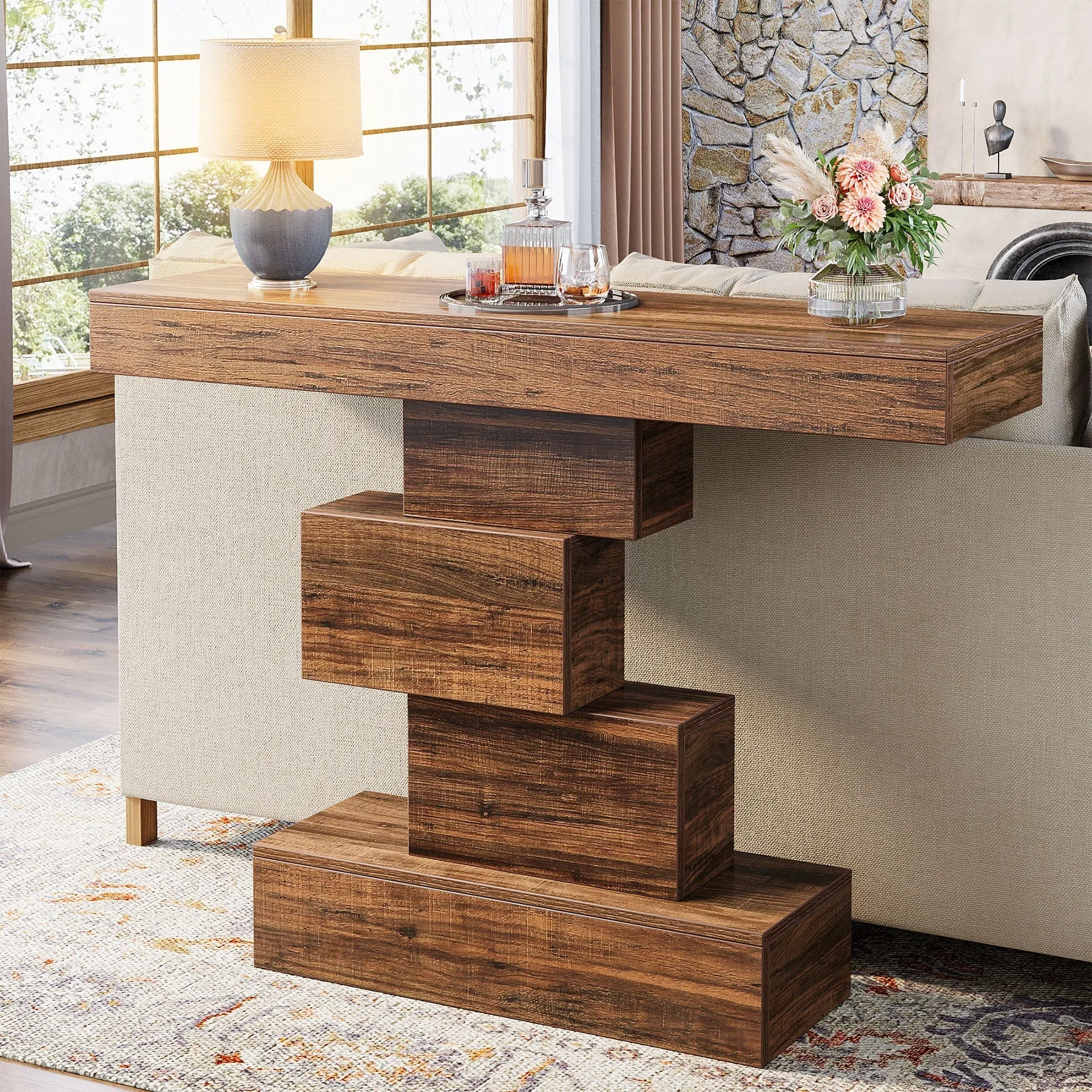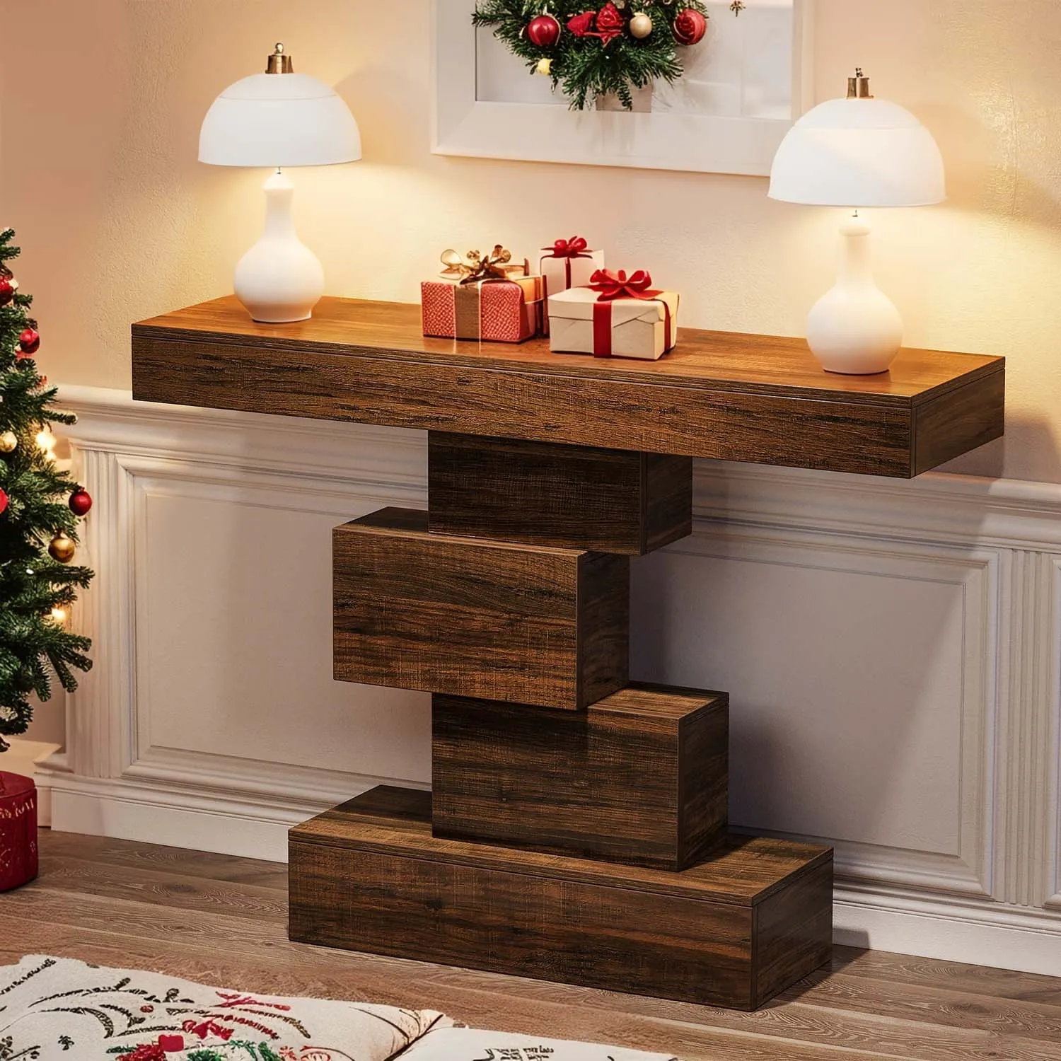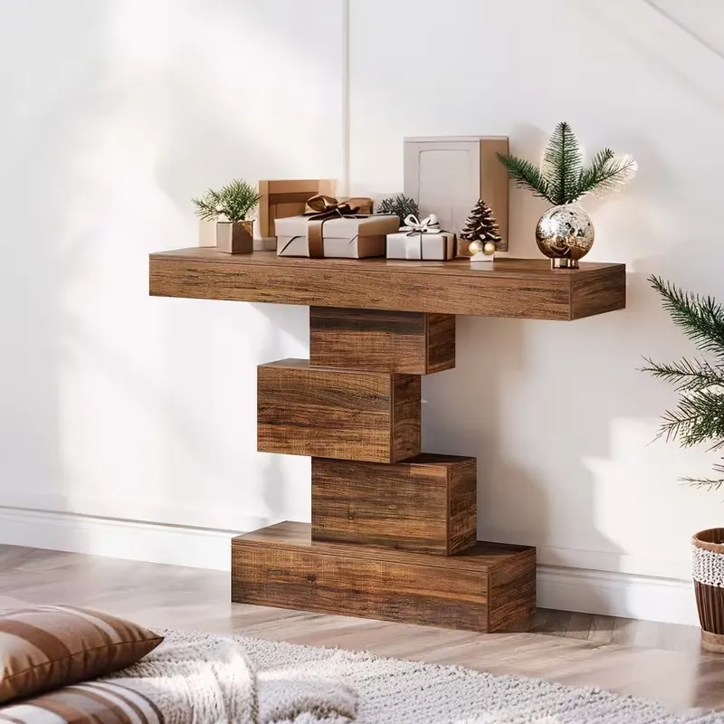 - Geometriskt utformad bas: Detta bord erbjuder en perfekt plats för att visa upp dekorativa föremål som lampor, vaser och familjefoton. Kombinationen av funktionalitet och estetik gör dess geometriska bas till ett unikt inslag i hallen eller entrén.