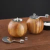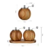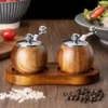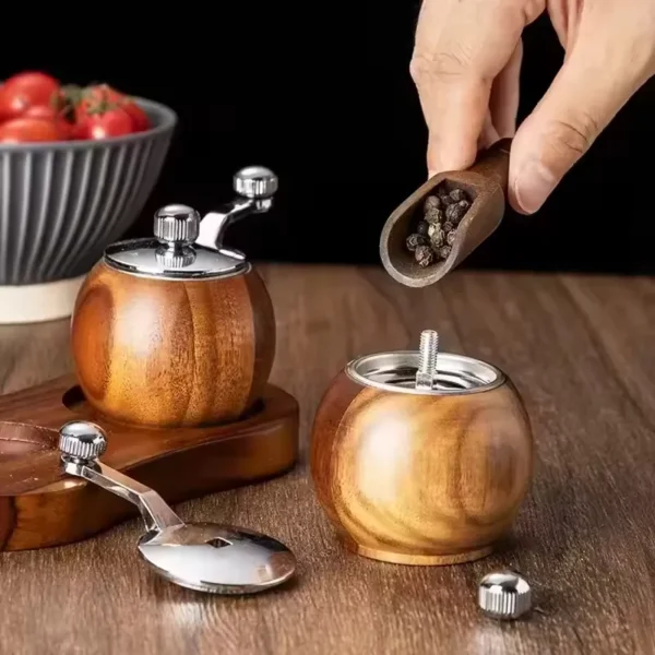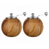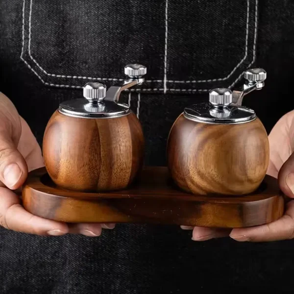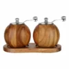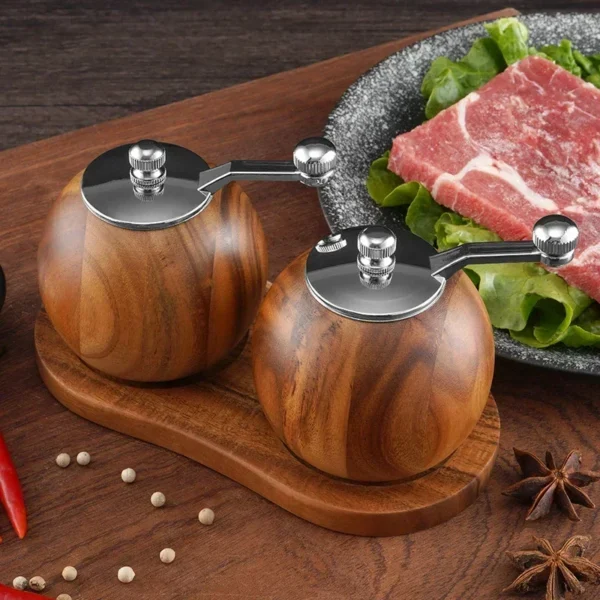 Kvarnarna är tillverkade av vackert akaciaträ och har en rund, klotformad design som står elegant på en matchande bricka. Varje kvarn är utrustad med en högkvalitativ kvarn i rostfritt stål för effektiv kryddning, vilket ger både hållbarhet och en modern känsla.