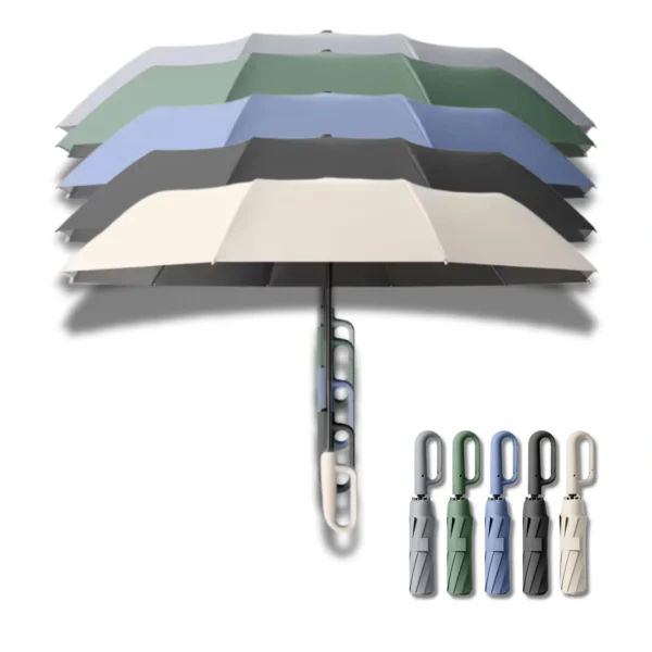 Detta kraftfulla paraply, utrustat med ett automatiskt öppnings- och stängningssystem, erbjuder utmärkt skydd mot både regn och sol. Med sin vindtåliga ram och robusta förstärkningar klarar det även av tuffa väderförhållanden utan att tappa stabiliteten.