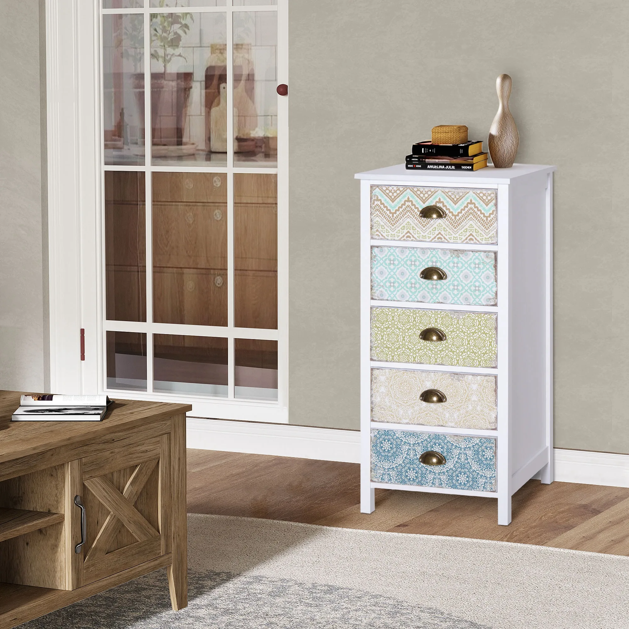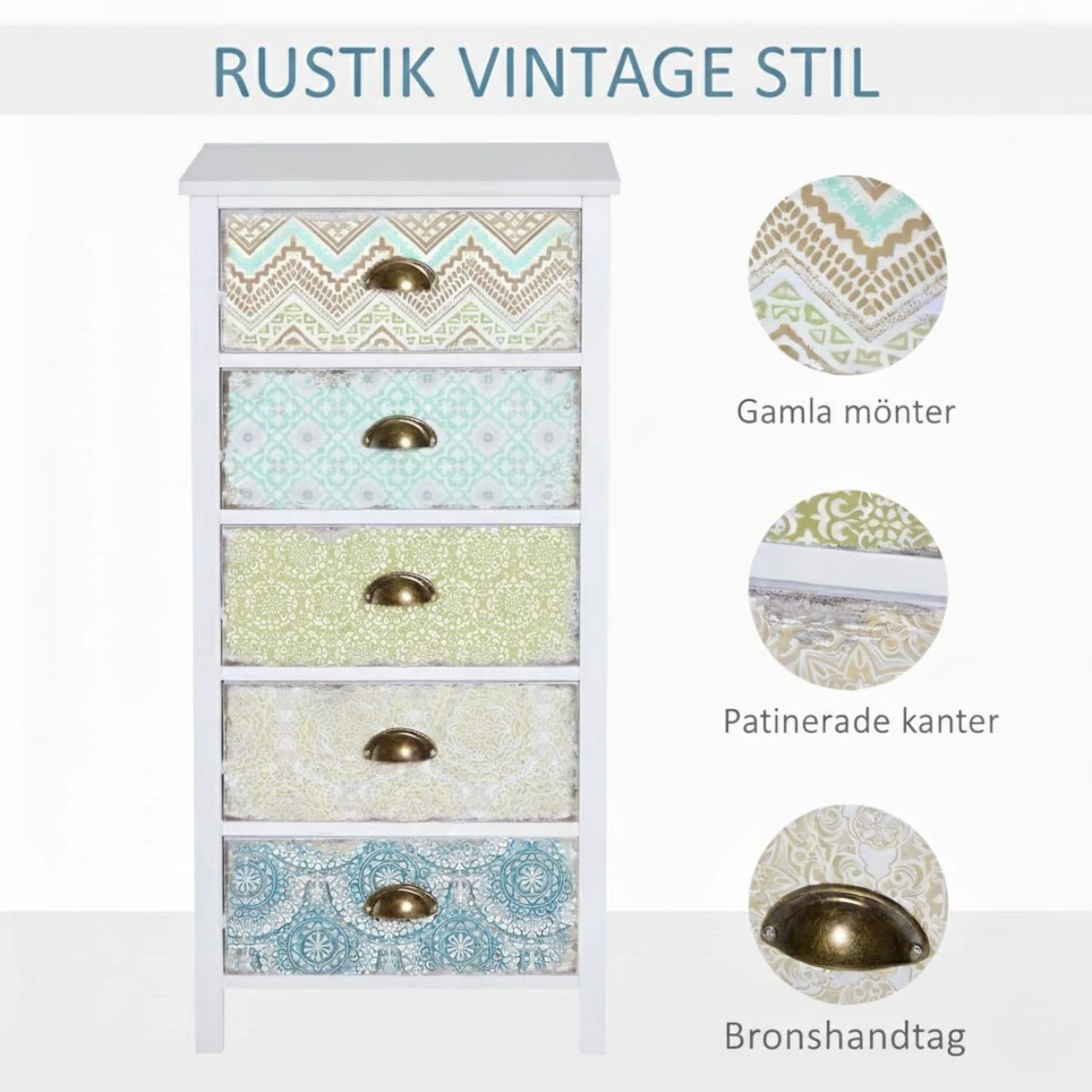 - Dekorativ design: Lådfronter i varierande toner ger möbeln personlighet utan att kännas rörig.