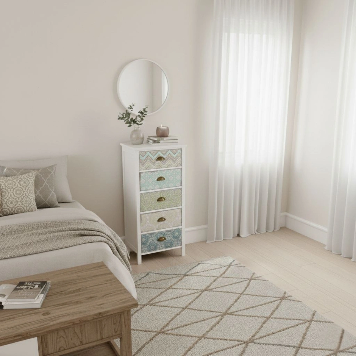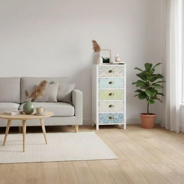 - Genomtänkt förvaring: Fem lådor ger bra plats för kläder, textilier och vardagsföremål – perfekt för att hålla ordning på ett diskret sätt.