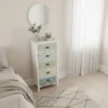 Denna byrå är utformad för att ge både funktion och karaktär. Med sina fem lådor erbjuder den gott om förvaringsutrymme samtidigt som de dekorativa fronterna skapar ett levande men balanserat uttryck. Passar utmärkt i sovrum, hall eller vardagsrum.