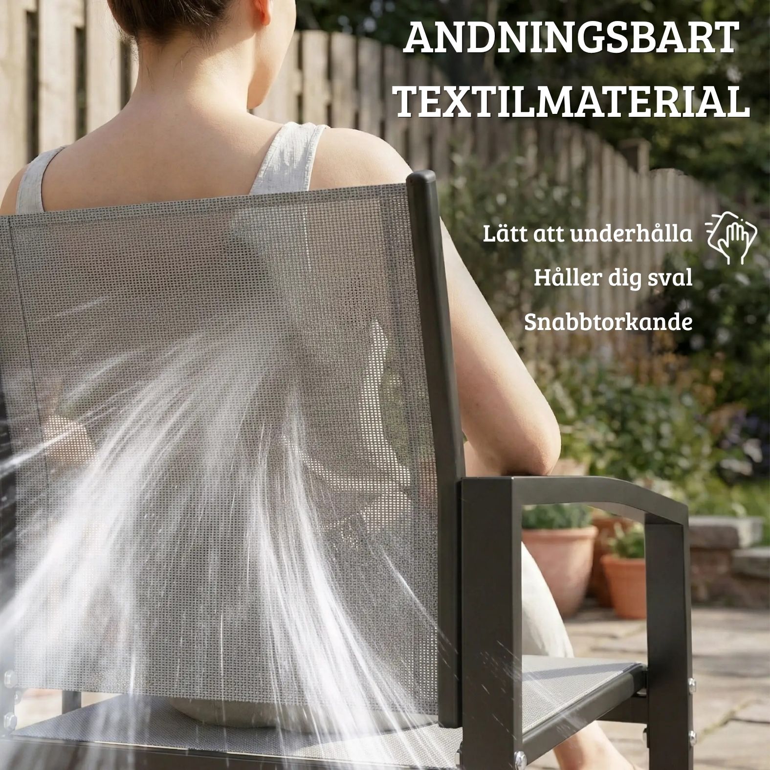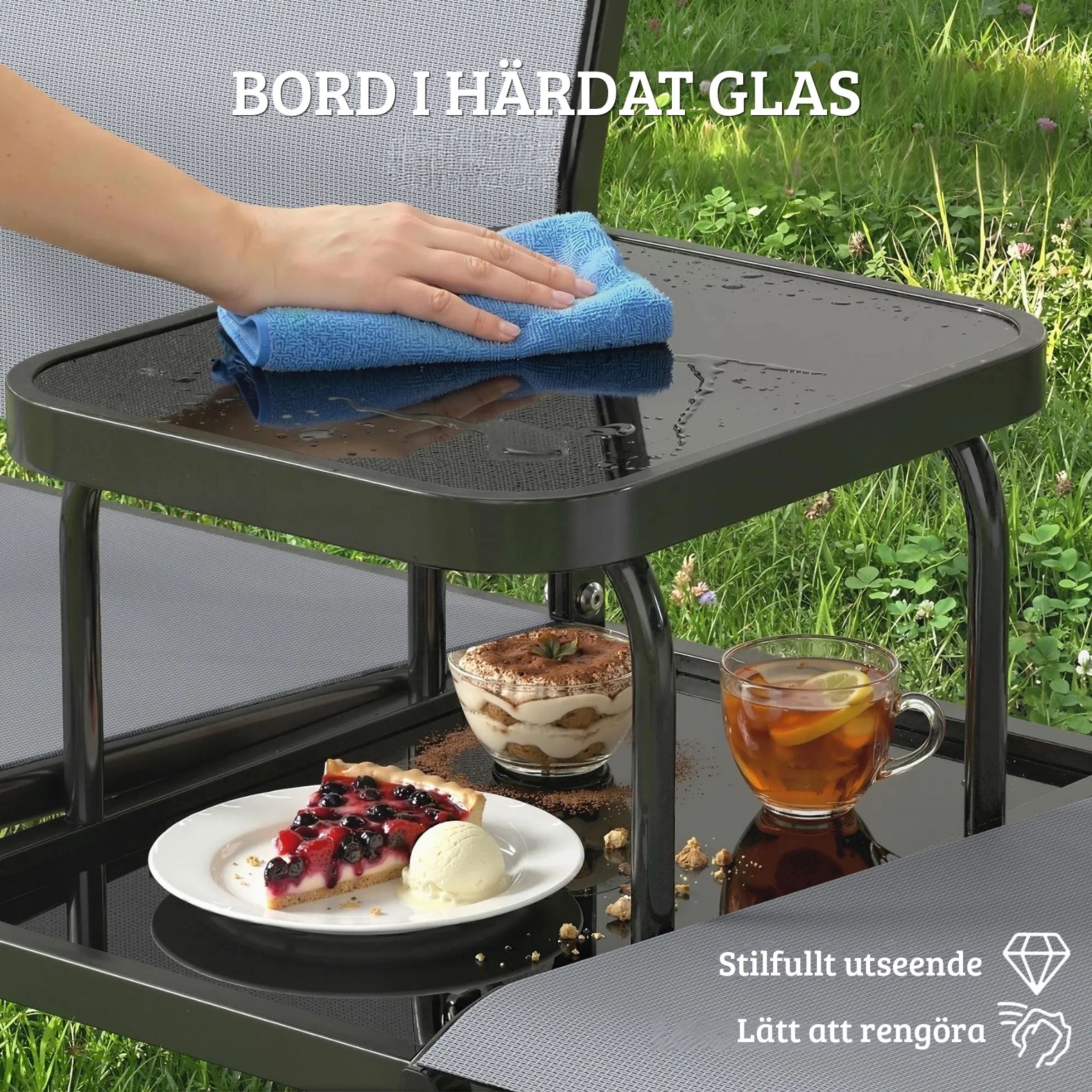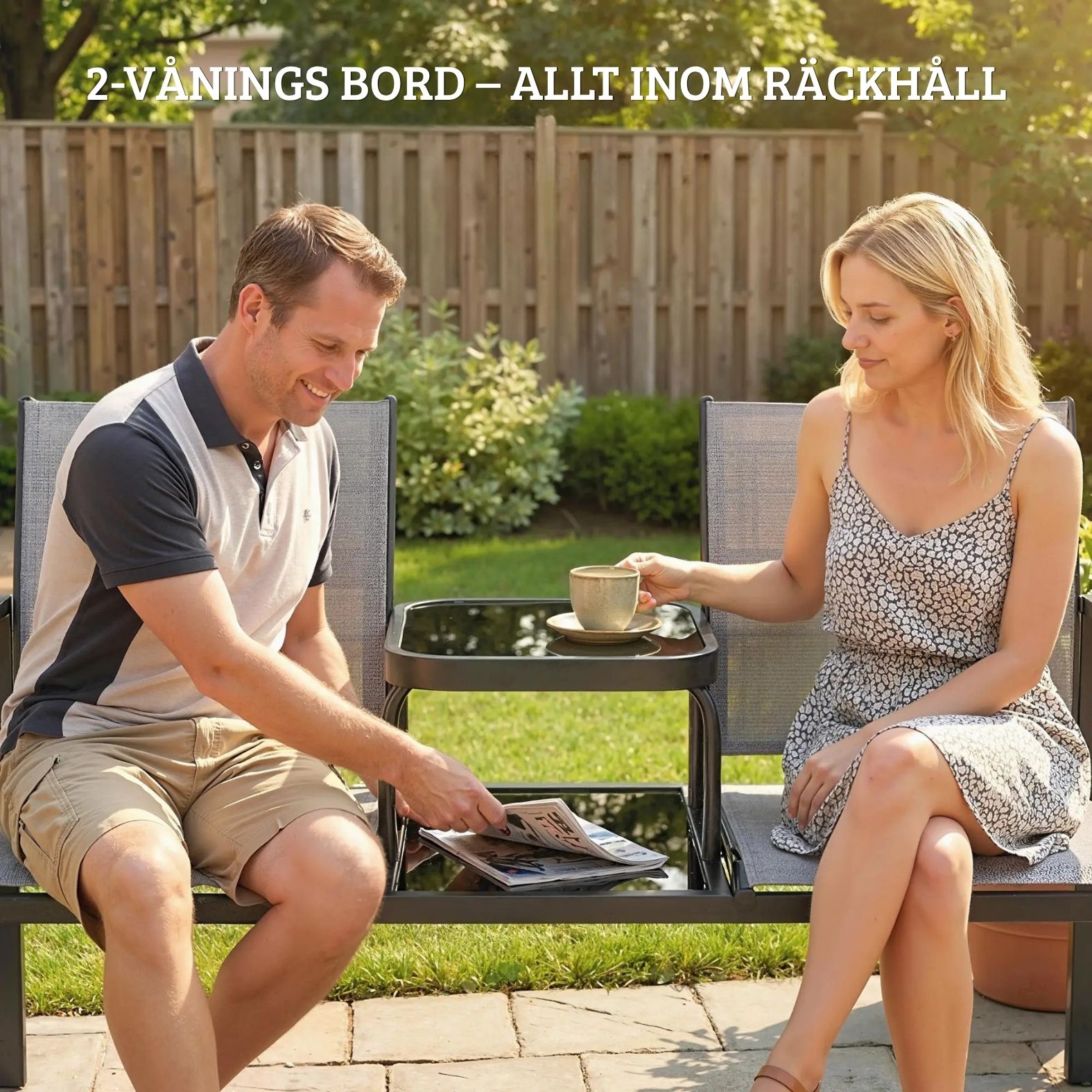 Den smarta designen kombinerar två bekväma sittplatser med ett praktiskt tvåvåningsbord i mitten – perfekt för kaffe, böcker eller andra småsaker inom räckhåll. En idealisk lösning för avkopplande stunder i trädgården, på altanen eller balkongen.