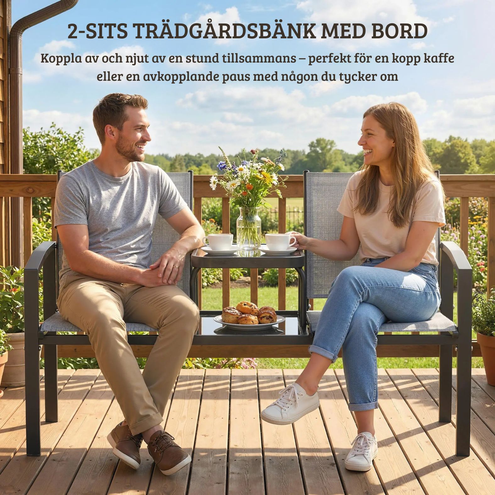 - 2-sits trädgårdsbänk med integrerat tvåvåningsbord i mitten