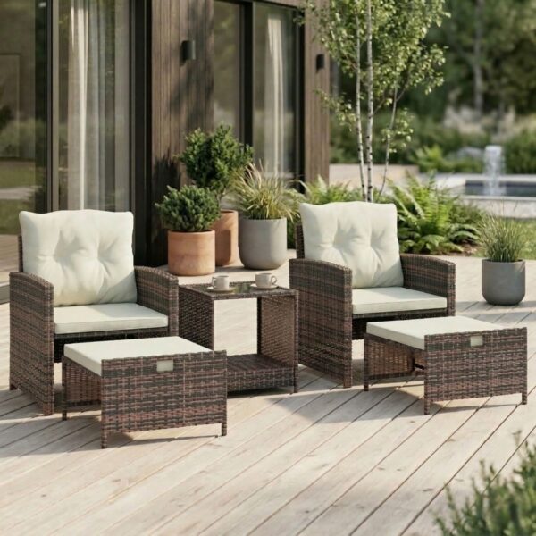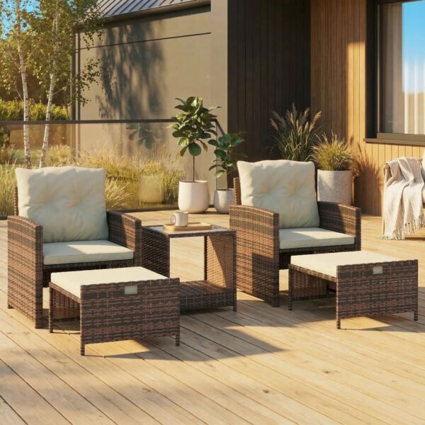 Skapa en stilren och avkopplande plats på balkongen, i trädgården eller på uteplatsen med detta eleganta 5-delade möbelset i konstrotting