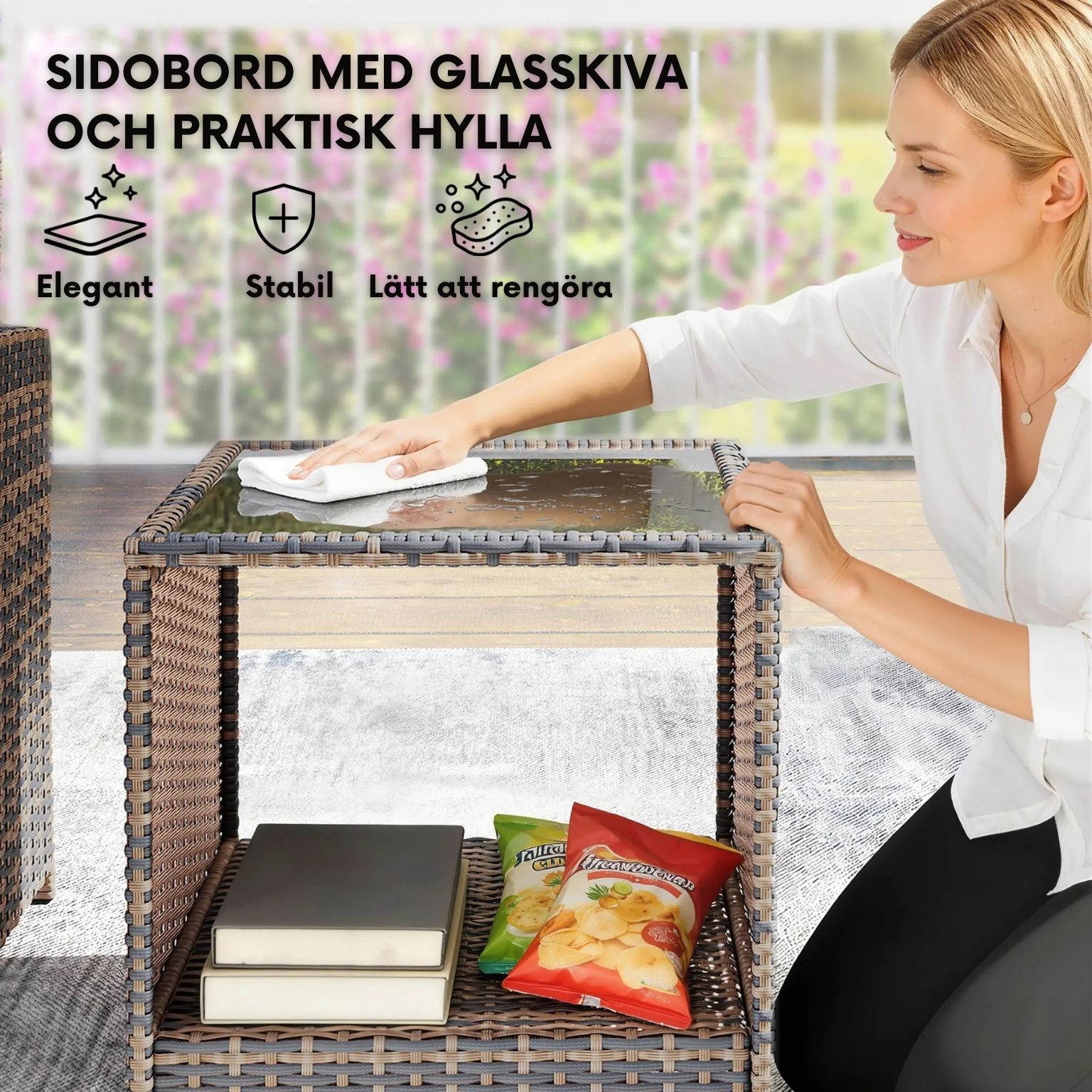 - Material: PE-rotting, stål, polyester, härdat glas, PP-bomull