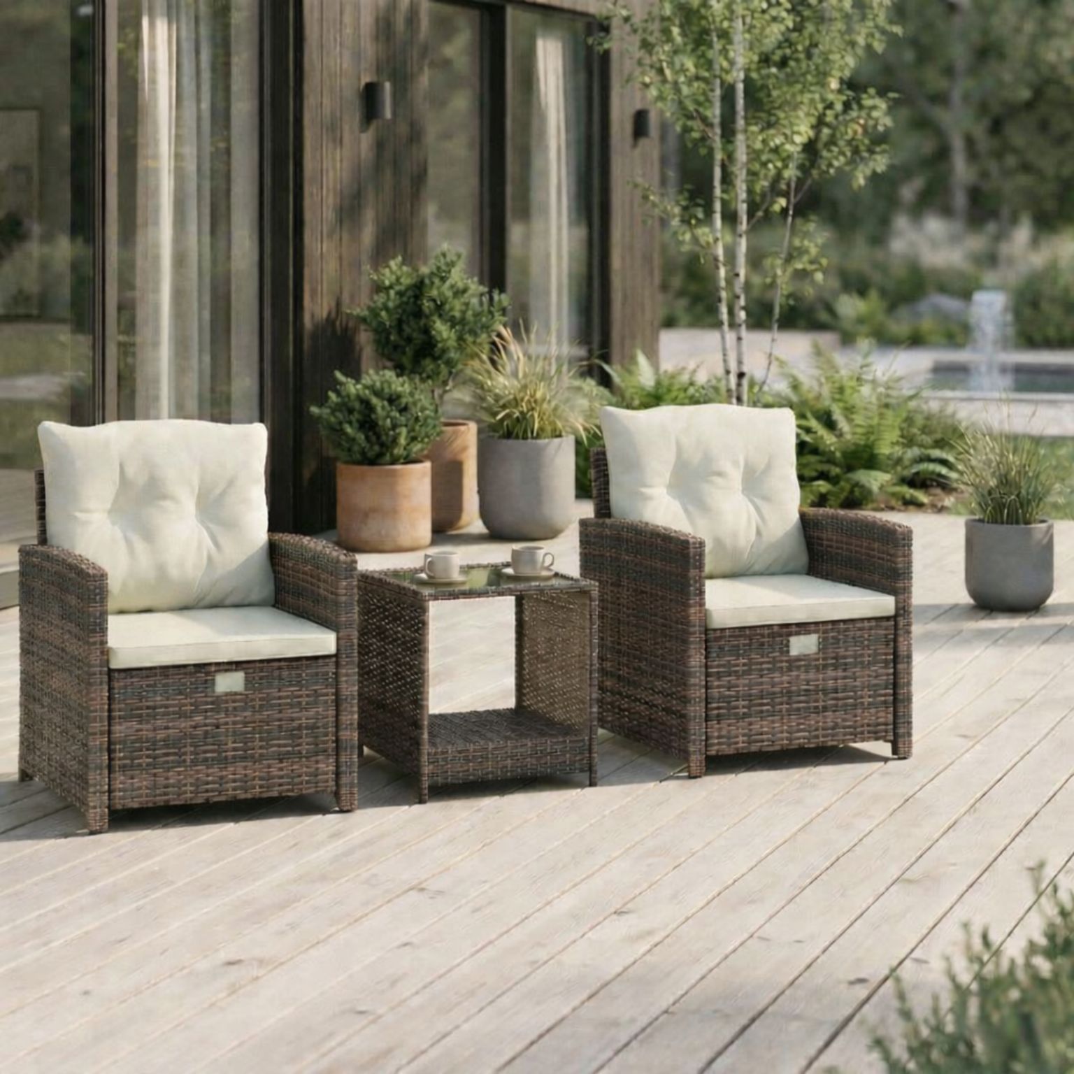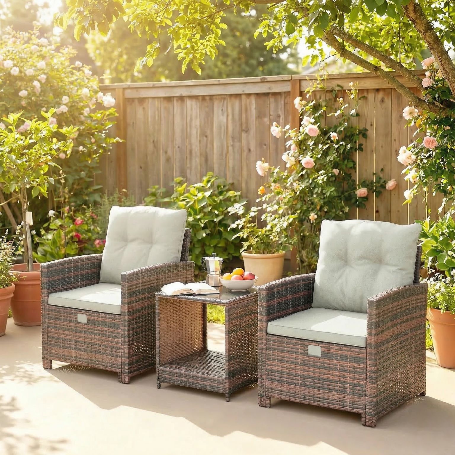 Setet består av två bekväma fåtöljer, två praktiska fotpallar och ett stilrent bord med glasskiva. Perfekt för avkoppling, fika eller trevliga stunder utomhus.