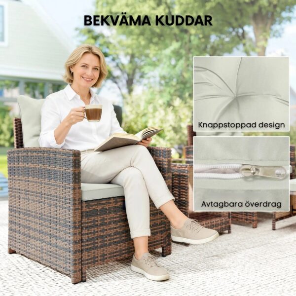 De smarta fotpallarna kan användas som fotstöd, extra sittplatser eller små sidobord. När de inte används kan de enkelt skjutas in under fåtöljerna för att spara plats – en praktisk lösning för balkonger och mindre uteplatser.