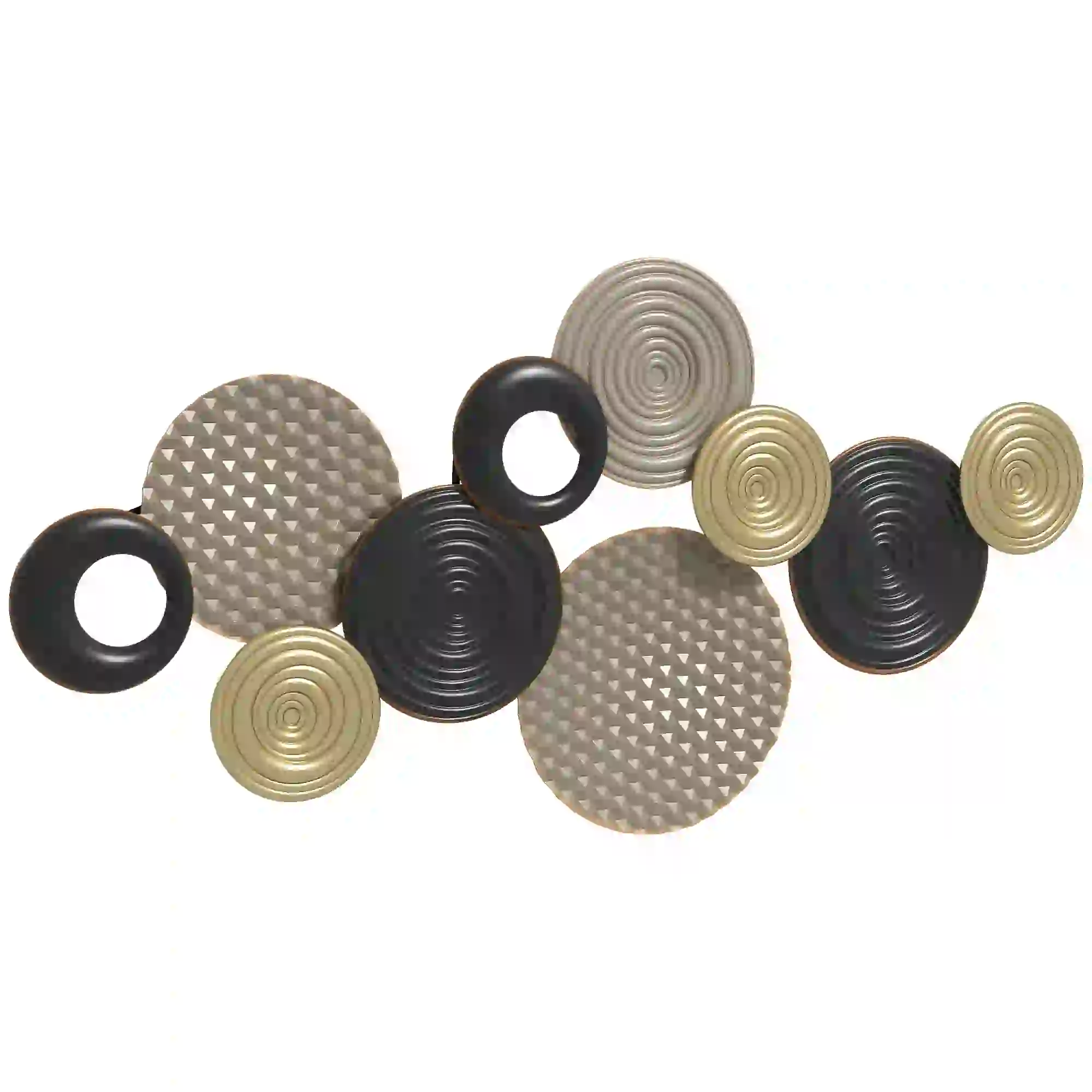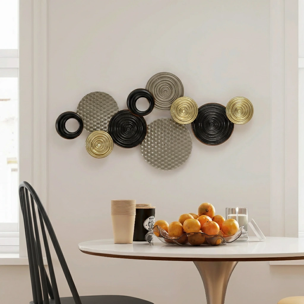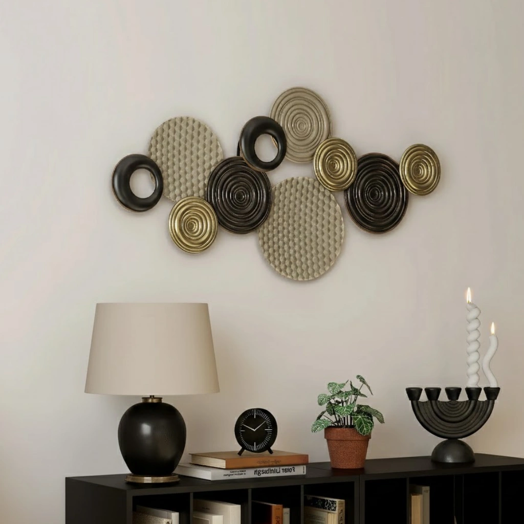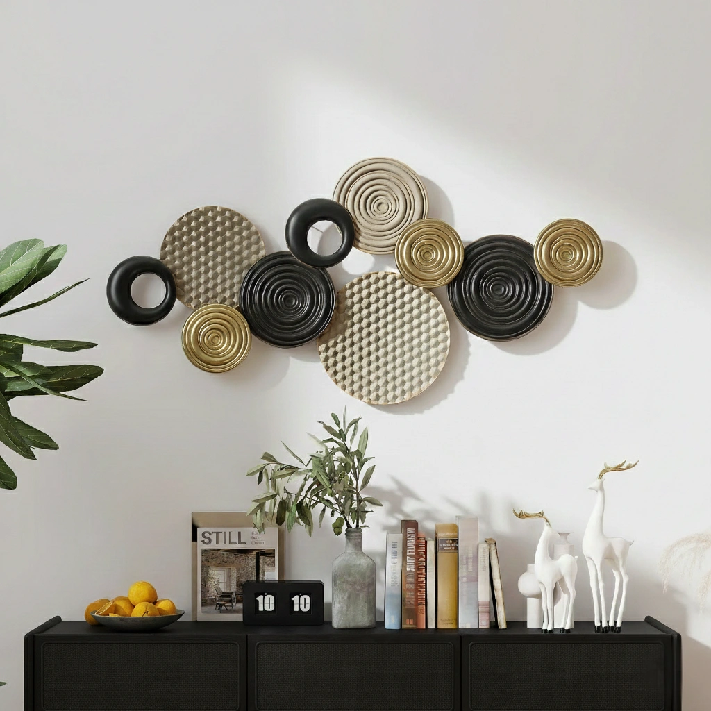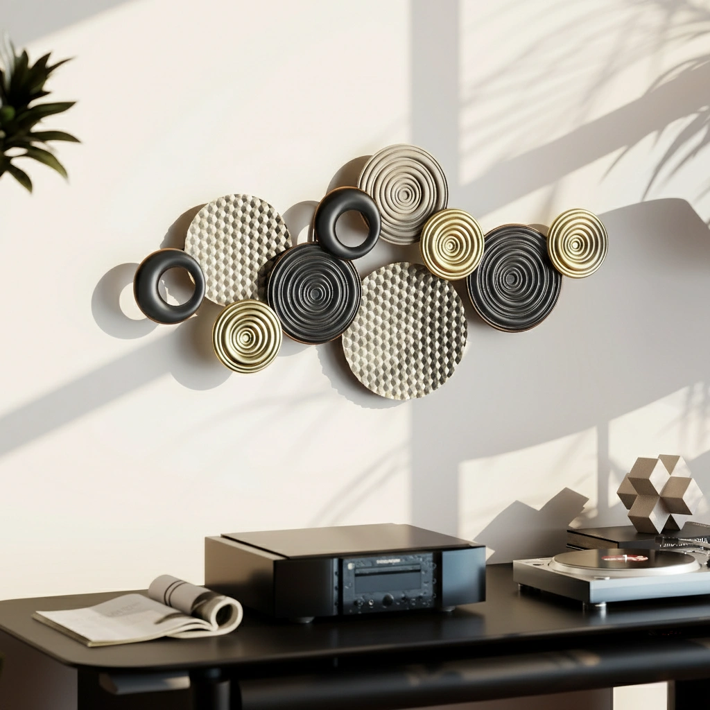 Att stirra på en stor, tom vägg kan få hela vardagsrummet att kännas platt och livlöst. Med denna stilrena väggdekoration förvandlar du enkelt ytan till rummets självklara blickfång. Den abstrakta 3D-designen och de moderna metallpanelerna skapar djup, struktur och en sofistikerad känsla.