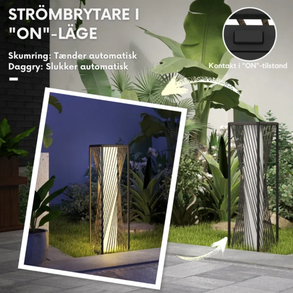 Ge uteplatsen eller trädgården en varm och inbjudande känsla med en elegant solcellslampa som kombinerar design och funktion. Lampan ger ett varmvit ljus på 2500 K och 15 lumen – perfekt för mysiga kvällar utomhus. Den tänds automatiskt vid skymning och släcks igen i gryningen, helt utan manuell hantering.