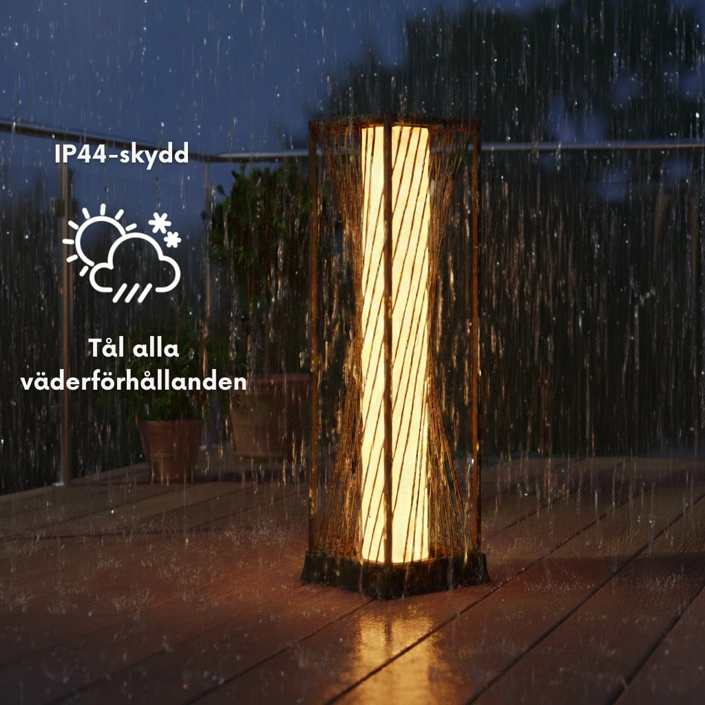 Den stilrena Boho-inspirerade utomhuslampan är handvävd i PE-rotting och kombinerad med en stabil stålram som gör den vädertålig och anpassad för utomhusbruk året runt. Fem timmars laddning i solljus ger upp till åtta timmars belysning.