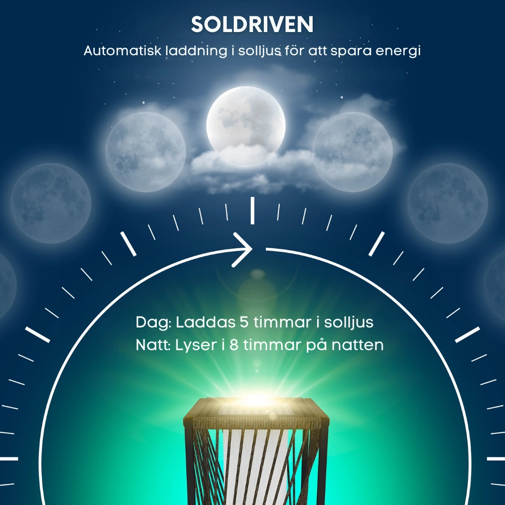 Ge uteplatsen eller trädgården en varm och inbjudande känsla med en elegant solcellslampa som kombinerar design och funktion. Lampan ger ett varmvit ljus på 2500 K och 15 lumen – perfekt för mysiga kvällar utomhus. Den tänds automatiskt vid skymning och släcks igen i gryningen, helt utan manuell hantering.