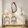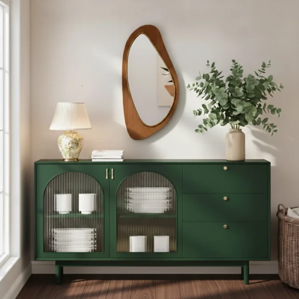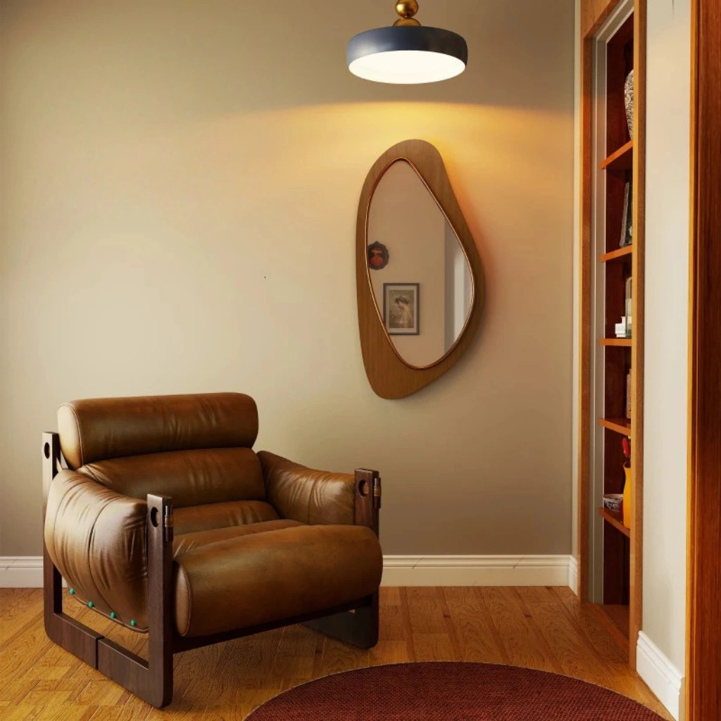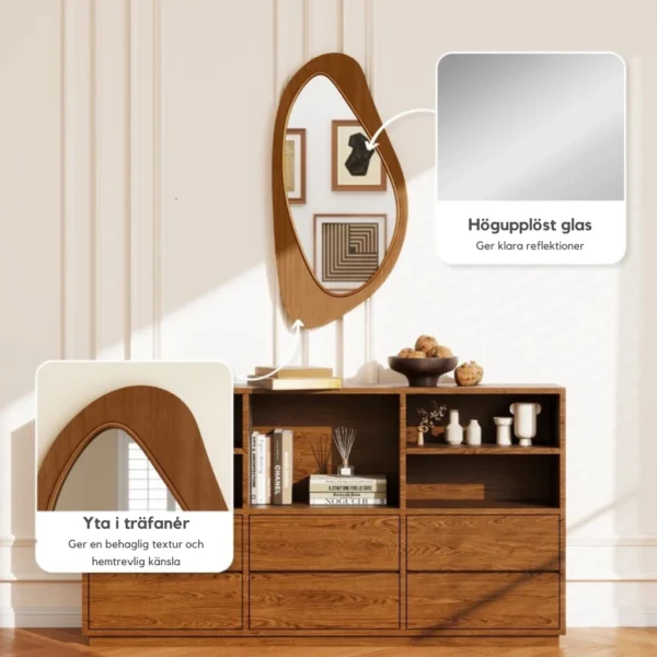 Med sina mjuka, konstnärliga linjer och den varma träramen förvandlar vår väggspegel vilket utrymme som helst. Hall­spegeln blir inte bara en imponerande blickpunkt, utan ger också en klar, distorsionsfri spegelbild som fyller rummet med ljus och diskret värme.