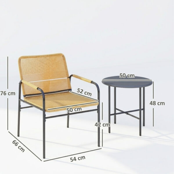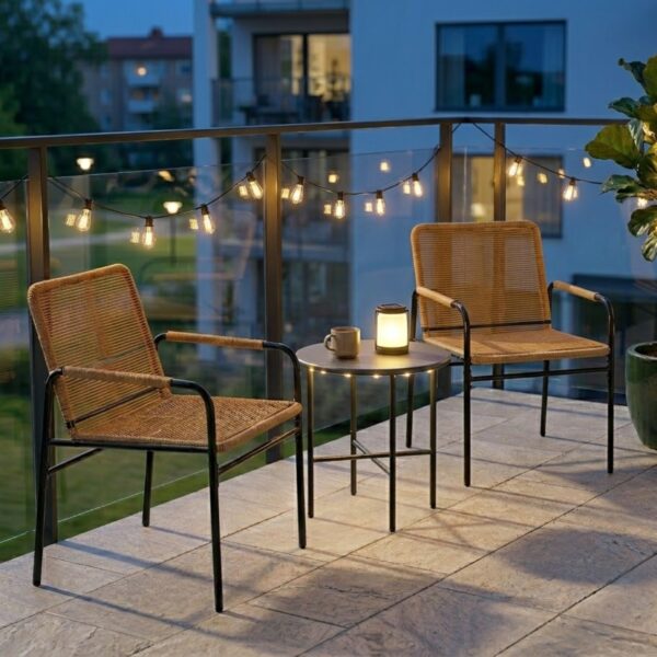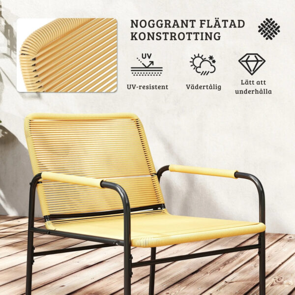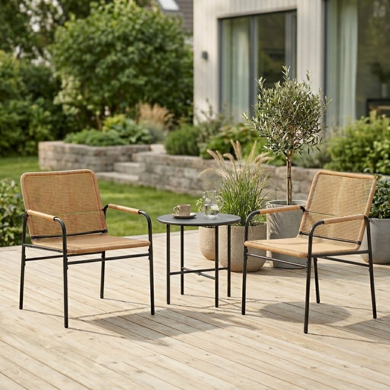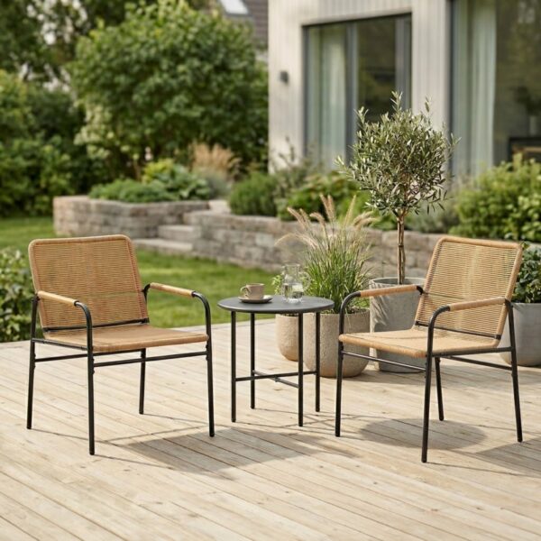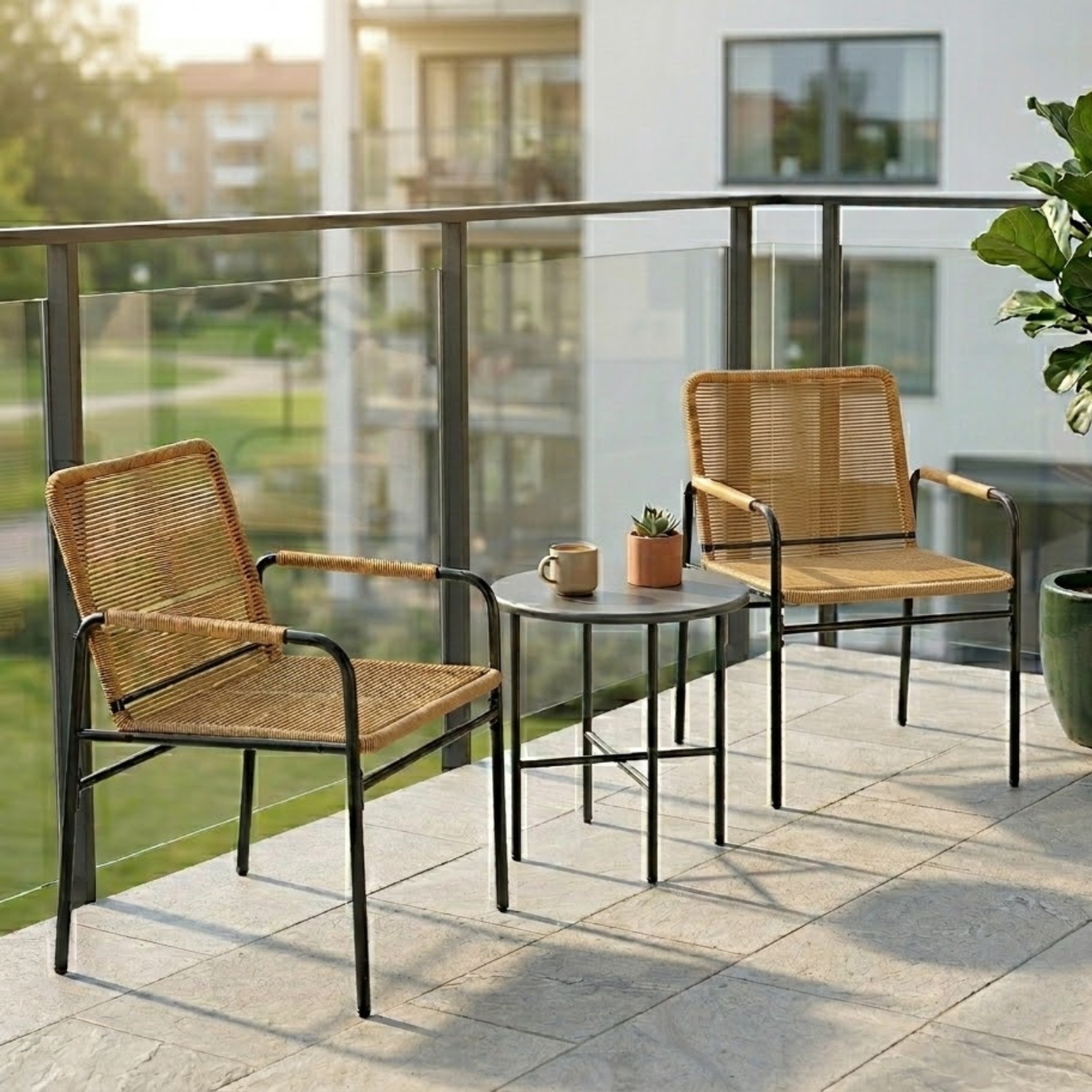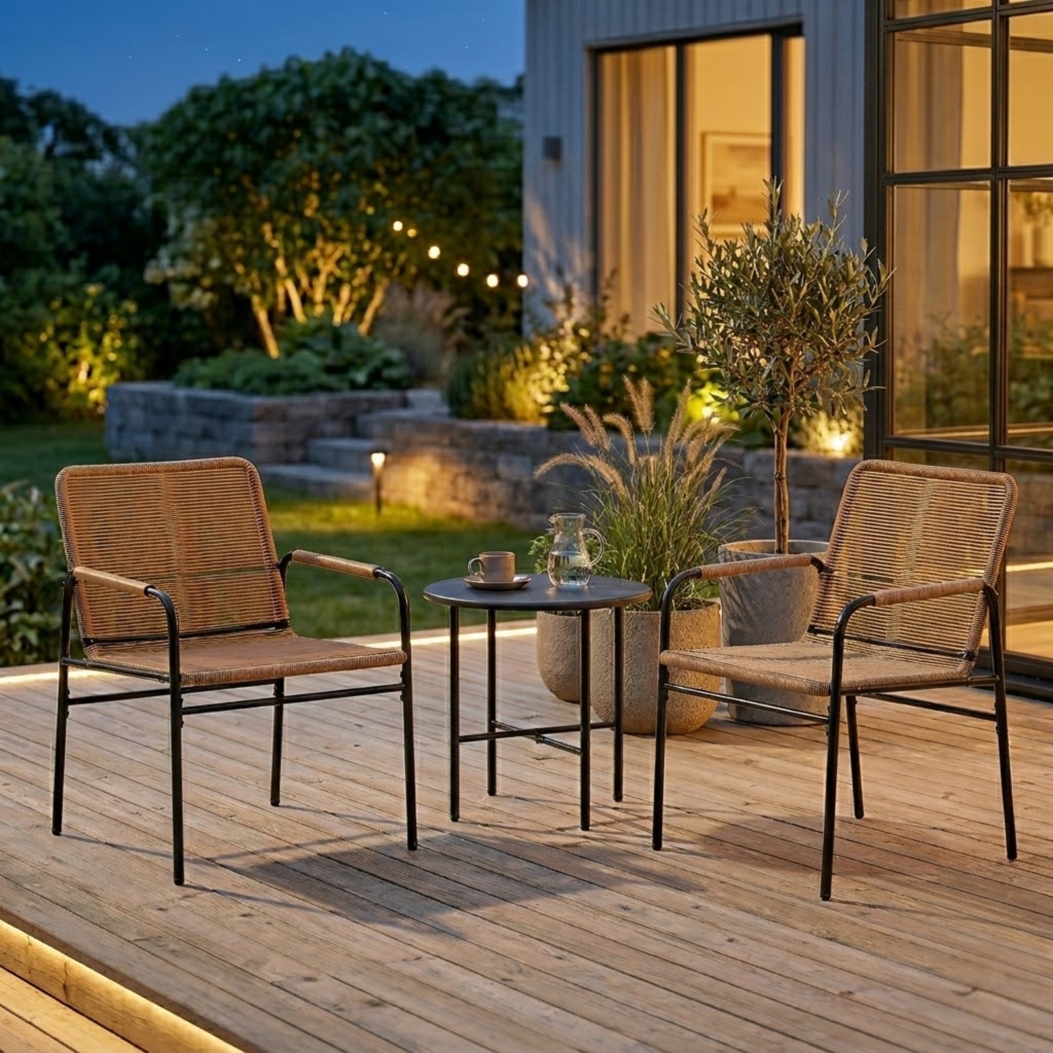 • Stilrent bistroset: Innehåller två bekväma rottingstolar och ett elegant bord med metallskiva – perfekt för kaffe, måltider eller avkoppling utomhus