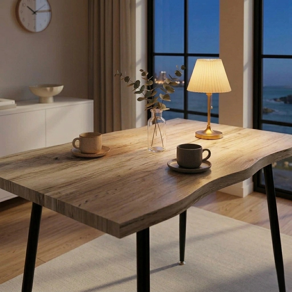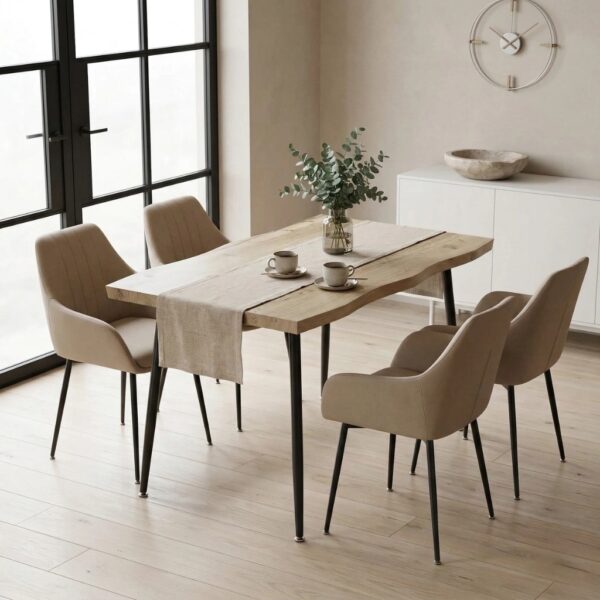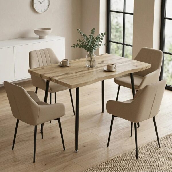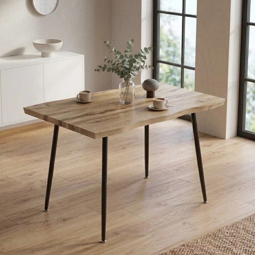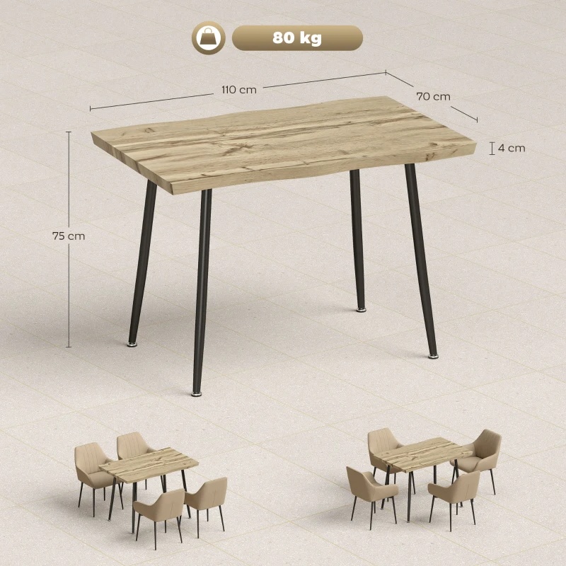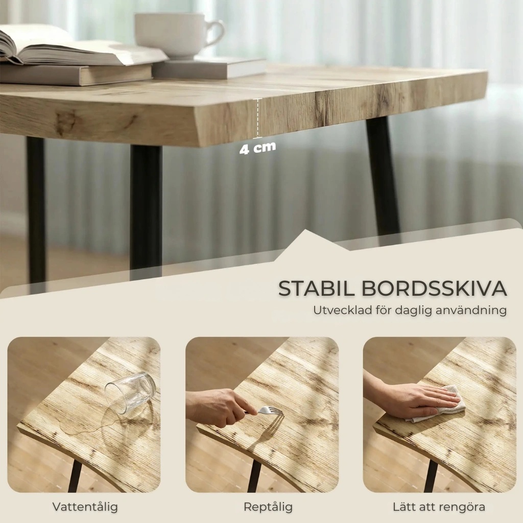Detta matbord kombinerar modern design med funktionalitet. Den 4 cm tjocka bordsskivan i ekfinish och den stabila stålramen ger en bärkapacitet på upp till 80 kg. Perfekt för middagar, hemarbete, kreativa projekt eller trevliga spelkvällar. De justerbara fötterna ger stabilitet även på ojämna golv, medan den stilrena designen gör bordet till en naturlig mittpunkt i hemmet.
