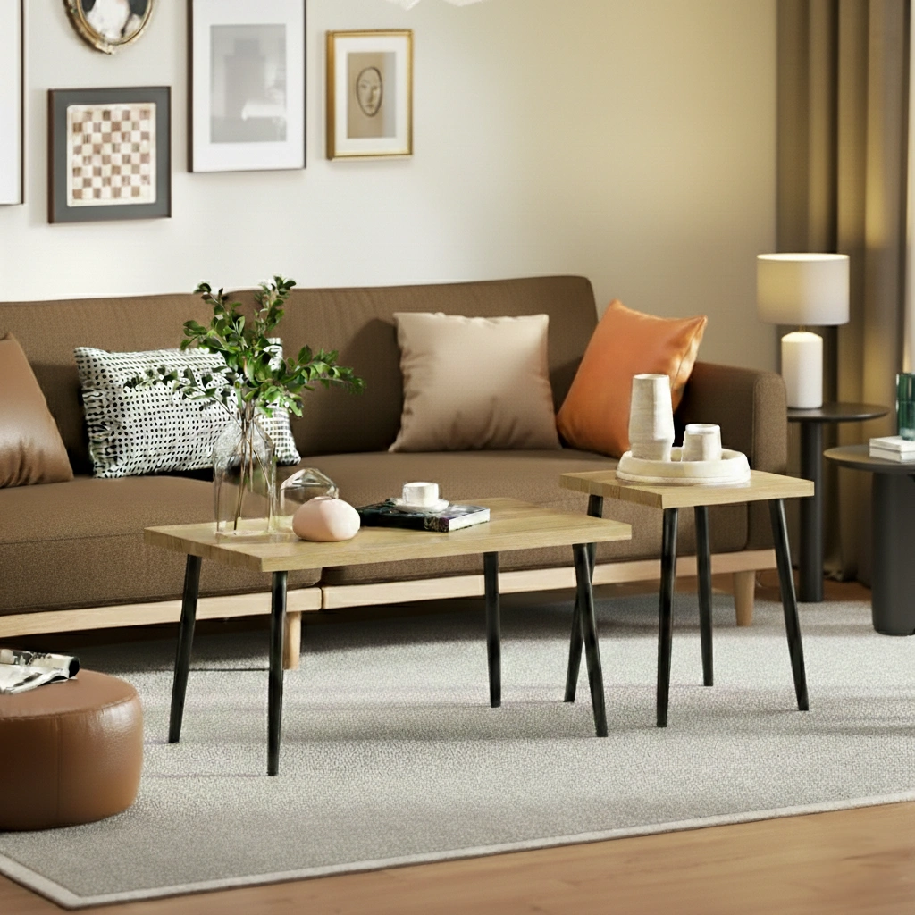 Den naturliga trälooken i kombination med de slanka, svarta benen skapar ett modernt industriellt uttryck som passar lika bra i klassiska som moderna hem. Borden är mångsidiga och kan användas som soffbord, sidobord eller dekorationsbord – perfekta för servering, prydnadsföremål eller extra avlastningsyta.