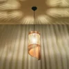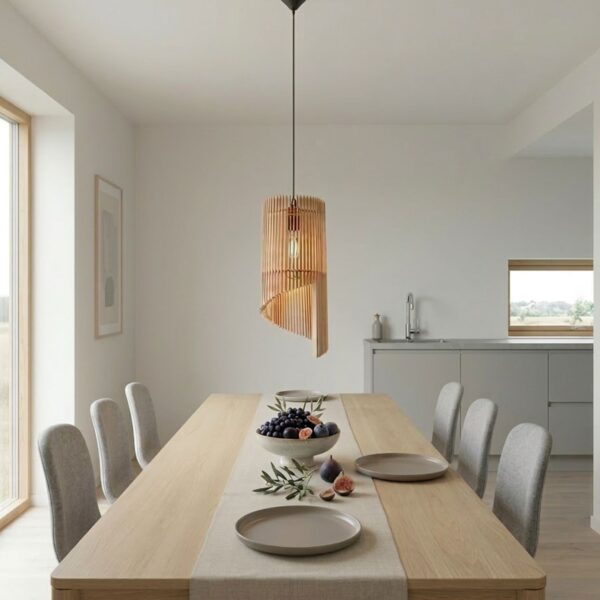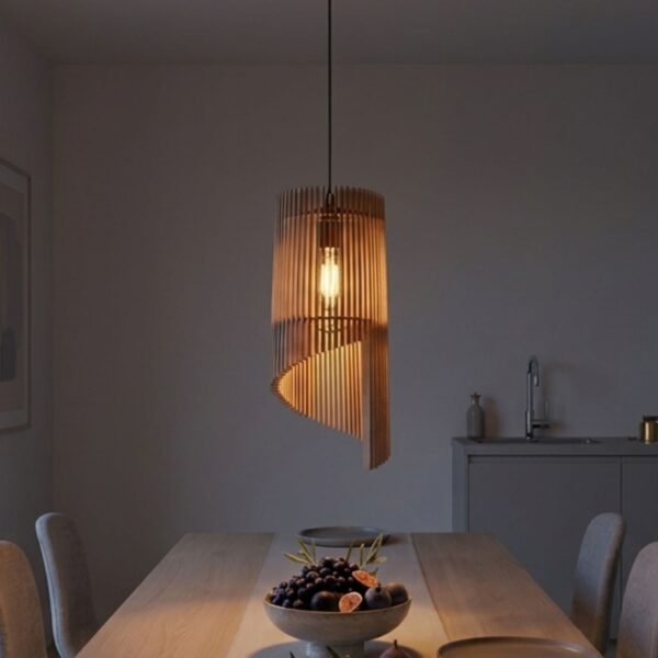 Skapa en varm och inbjudande atmosfär i hemmet med denna stilrena taklampa i naturligt trä