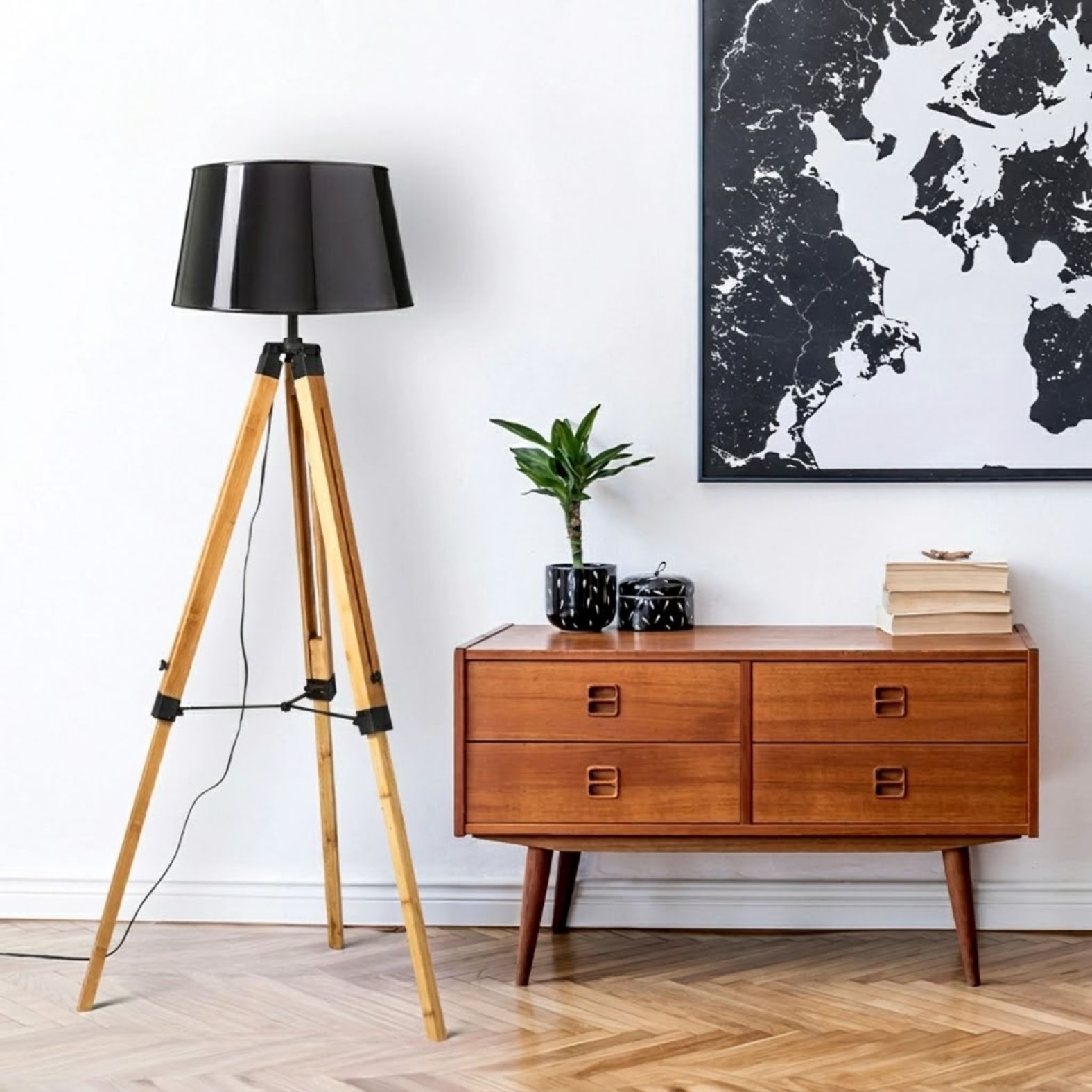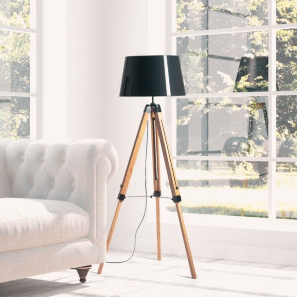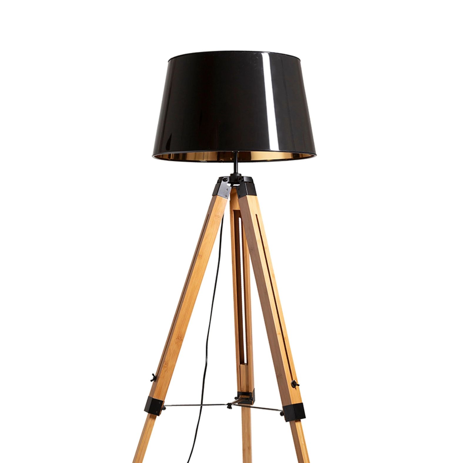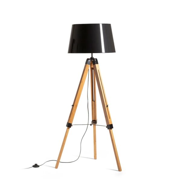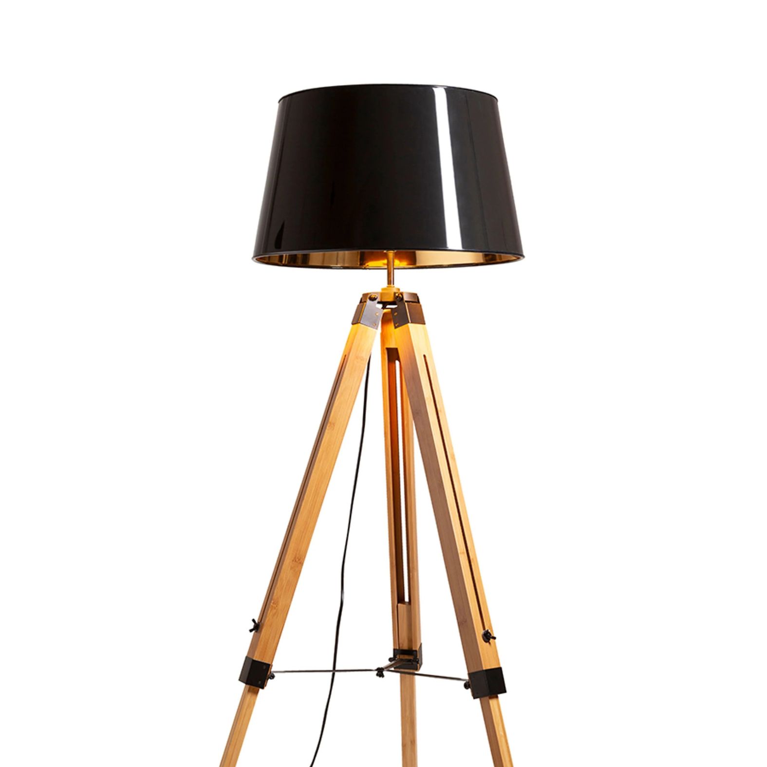 Skapa en varm och exklusiv atmosfär med denna eleganta trefotade golvlampa i bambu och blank svart design
