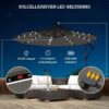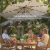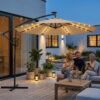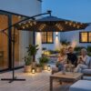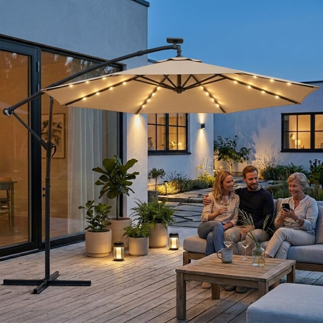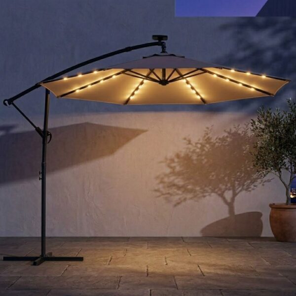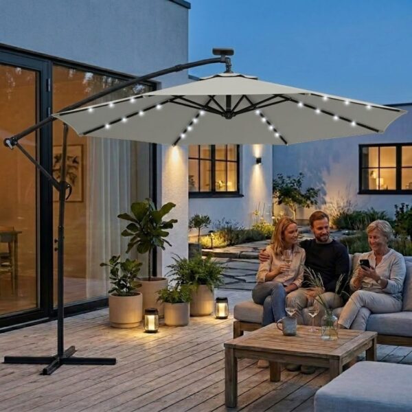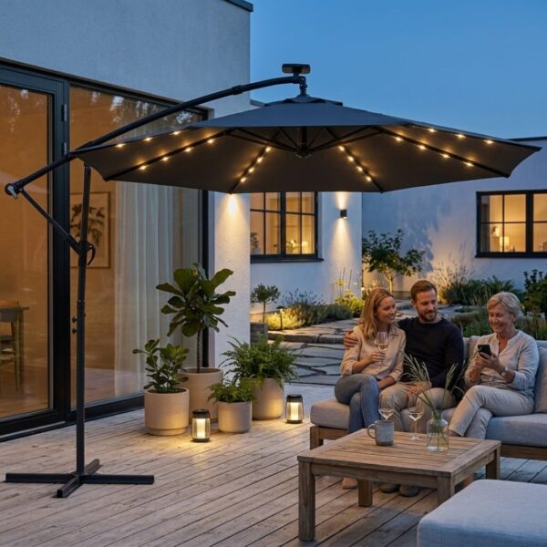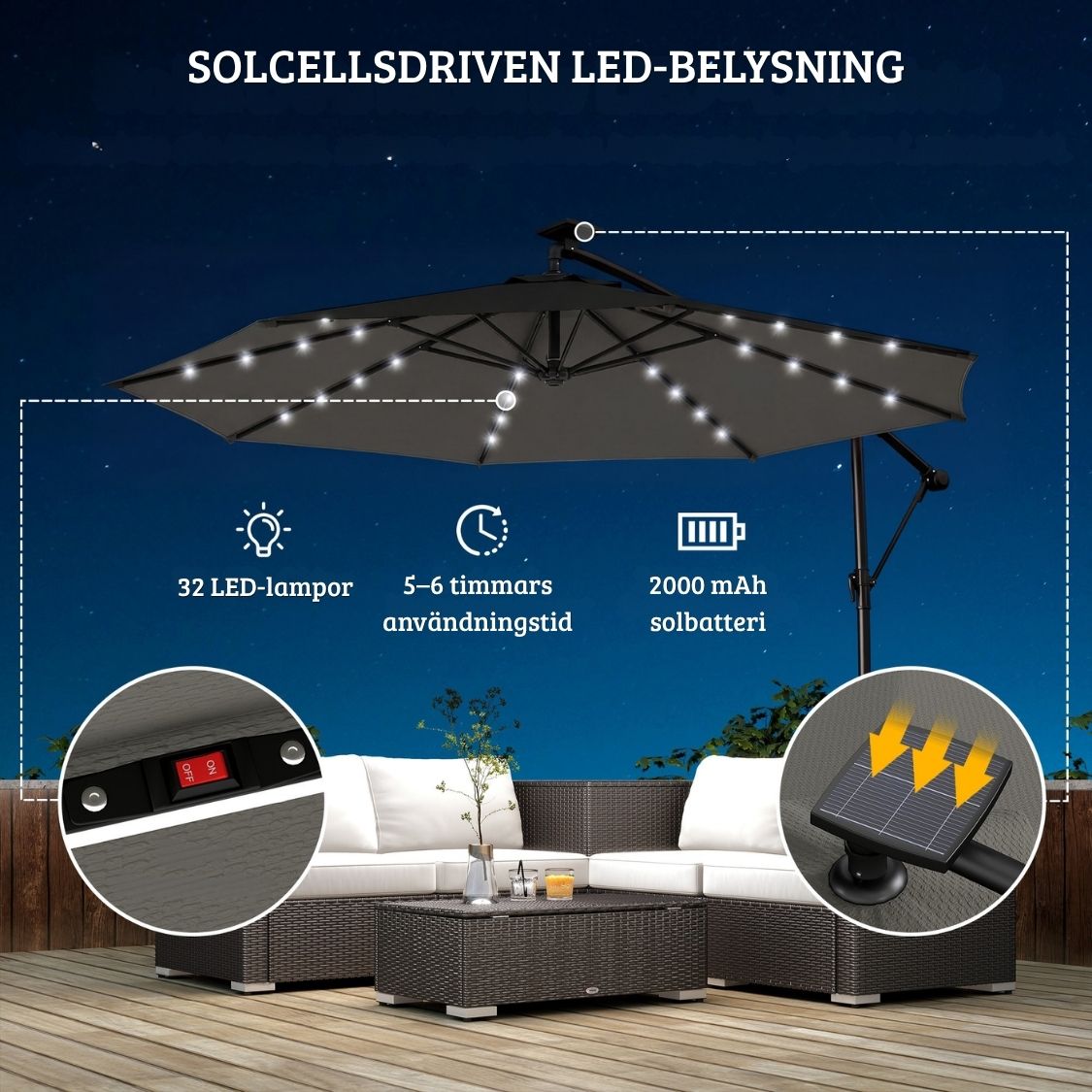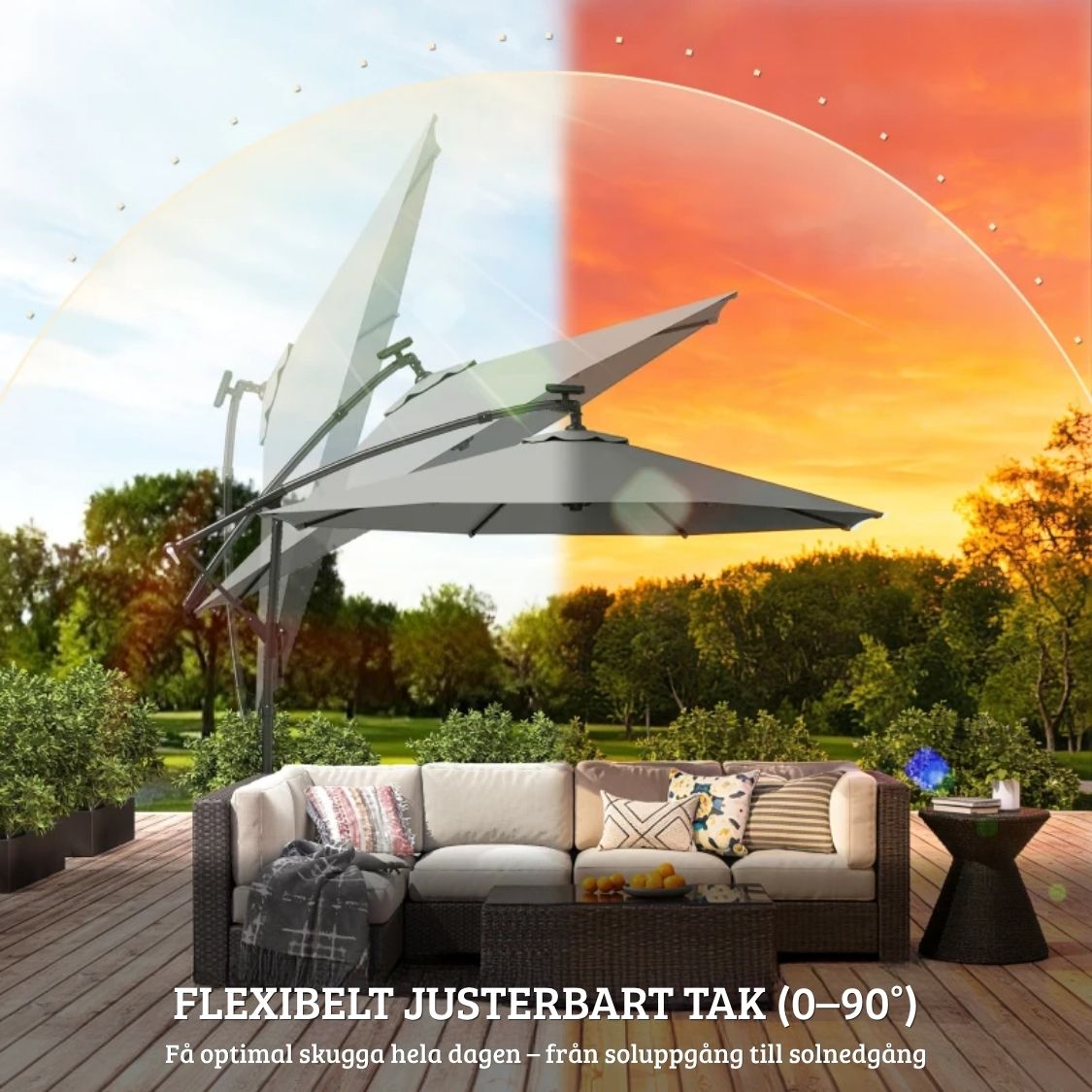 Den generösa storleken ger behaglig skugga under varma dagar, medan de integrerade solcellsdrivna LED-lamporna skapar en stämningsfull atmosfär när kvällen faller.
