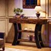 • Elegant konsolbord med svängda metallben: Detta stilrena konsolbord kombinerar rustik trälook med svängda metallben för ett modernt och industriellt uttryck. Designen bryter av mot traditionella raka former och ger rummet karaktär utan att ta över.