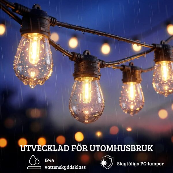 - Utomhusanpassad: IP44-klassad för säker användning i trädgård, på balkong eller uteplats