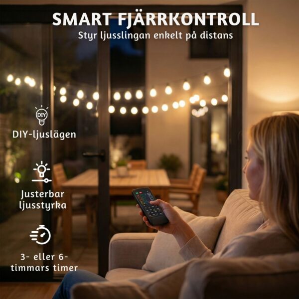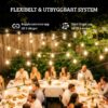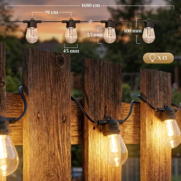 - Lång räckvidd: 16,8 m ljusslinga med 15 globlampor – kan kopplas ihop till 33,6 m
