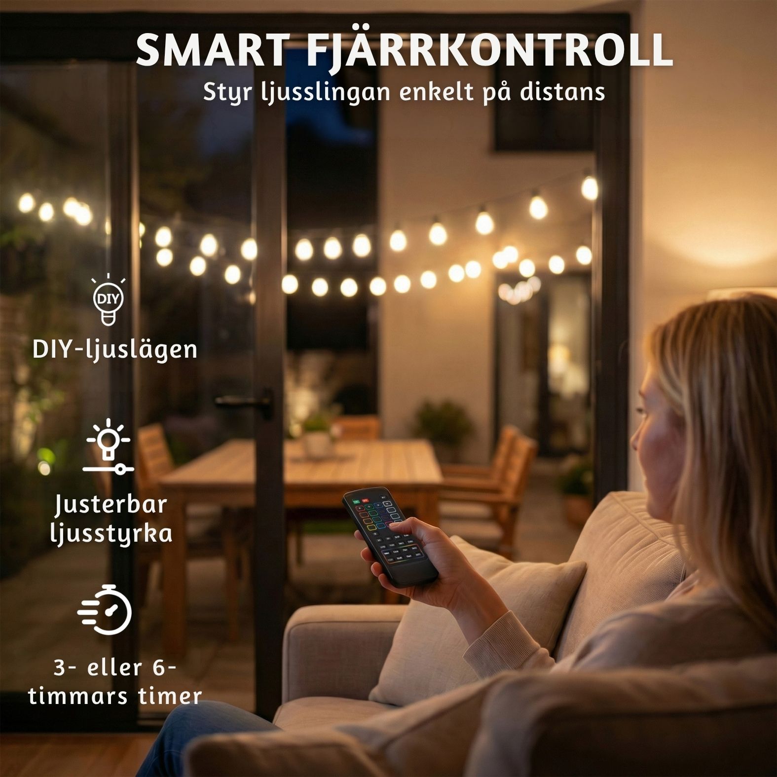 - Utomhusanpassad: IP44-klassad för säker användning i trädgård, på balkong eller uteplats