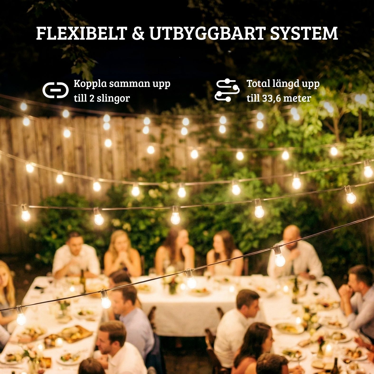 - Lång räckvidd: 16,8 m ljusslinga med 15 globlampor – kan kopplas ihop till 33,6 m