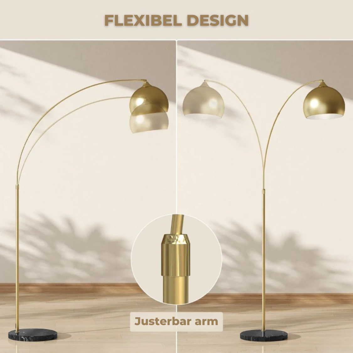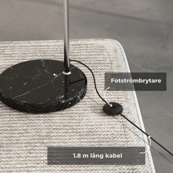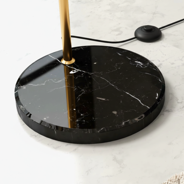 Den eleganta formen gör den perfekt för både läs- och vilohörnor, medan den justerbara armen gör det enkelt att anpassa ljuset efter behov. Den stabila marmorfoten ger både tyngd och ett exklusivt uttryck.