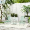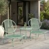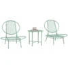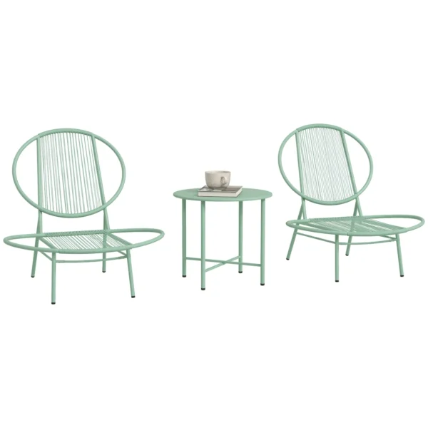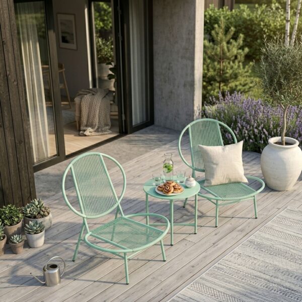 Setet består av två bekväma stolar med dekorativt musselformat ryggstöd och ett matchande bord – perfekt för morgonkaffet, en stund i solen eller trevliga samtal utomhus.