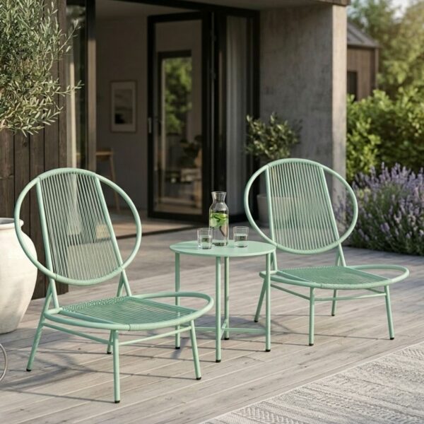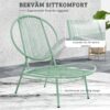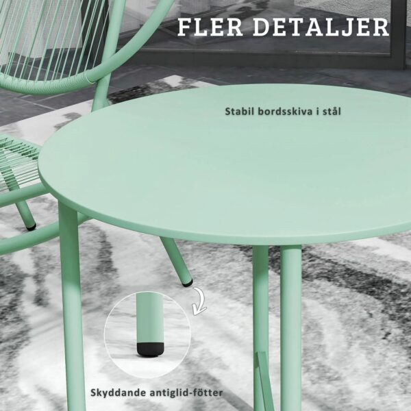 Den stabila konstruktionen i pulverlackerat stål tillsammans med slitstark PE-rotting gör möbelsetet både vädertåligt och hållbart. De ergonomiskt utformade stolarna ger bra sittkomfort medan bordet med stålskiva är lätt att hålla rent. Ett perfekt möbelset för mindre uteplatser, balkonger eller mysiga hörn i trädgården.