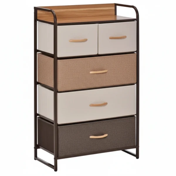 De fem rymliga tyglådorna i mjuka naturtoner ger flexibel förvaring för kläder, accessoarer och vardagens småsaker, samtidigt som den lätta konstruktionen gör möbeln enkel att flytta och anpassa efter behov. Den stabila metallstommen, kantade toppskivan och medföljande tippskydd ger trygg användning i vardagen utan att möbeln känns tung eller dominerande.