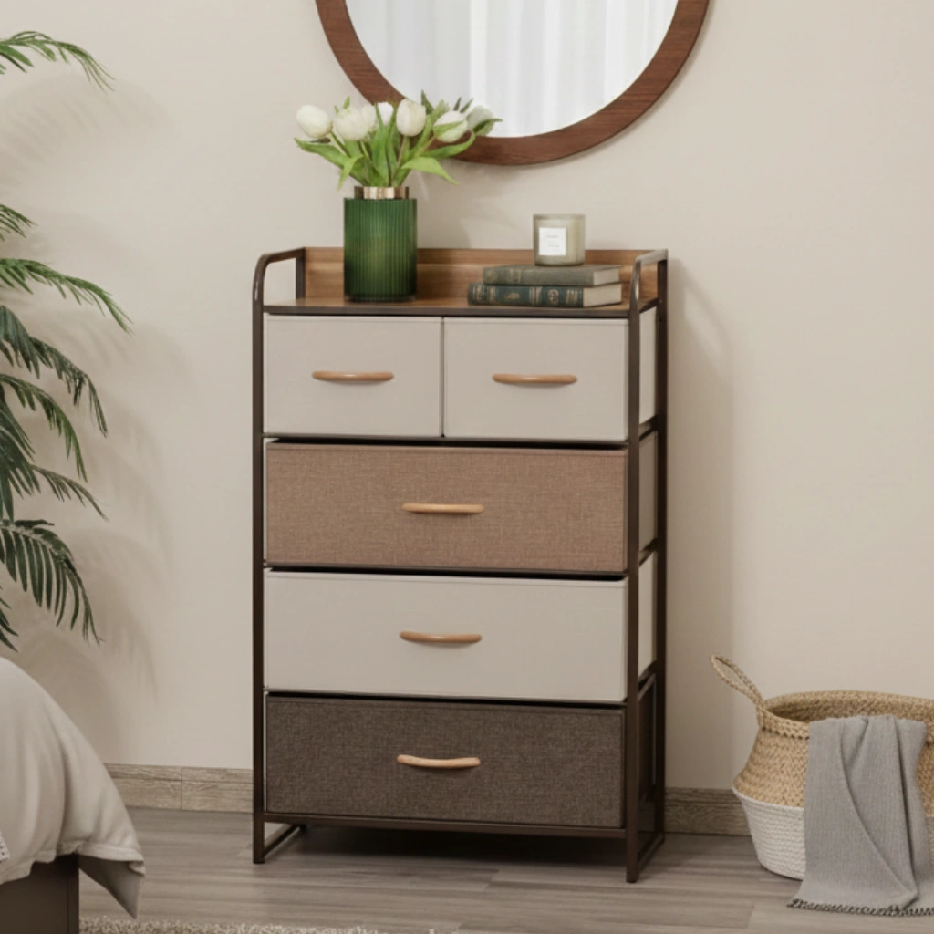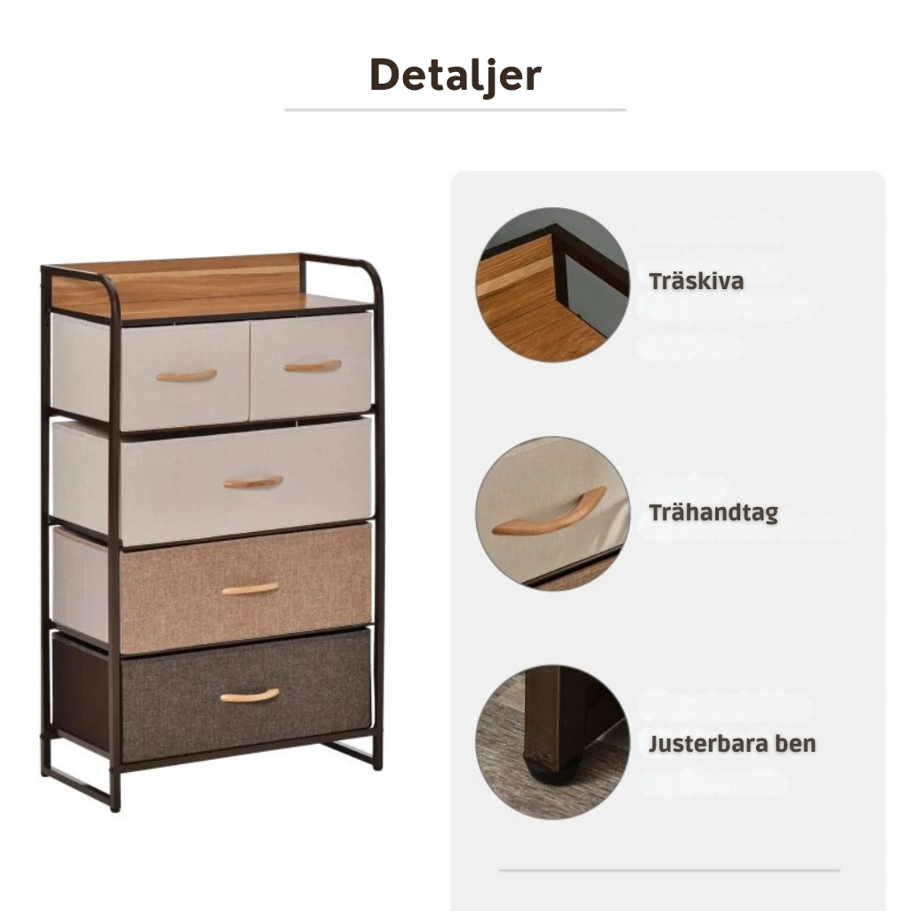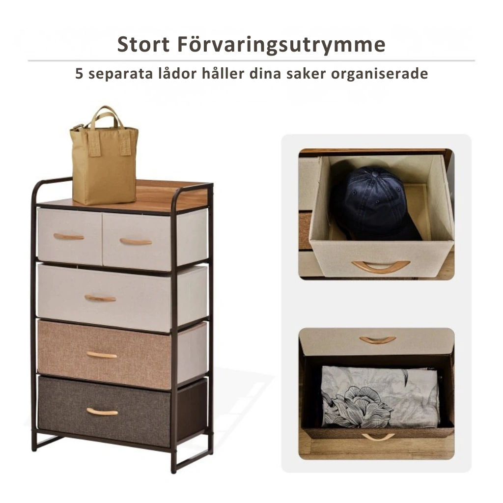 De fem rymliga tyglådorna i mjuka naturtoner ger flexibel förvaring för kläder, accessoarer och vardagens småsaker, samtidigt som den lätta konstruktionen gör möbeln enkel att flytta och anpassa efter behov. Den stabila metallstommen, kantade toppskivan och medföljande tippskydd ger trygg användning i vardagen utan att möbeln känns tung eller dominerande.