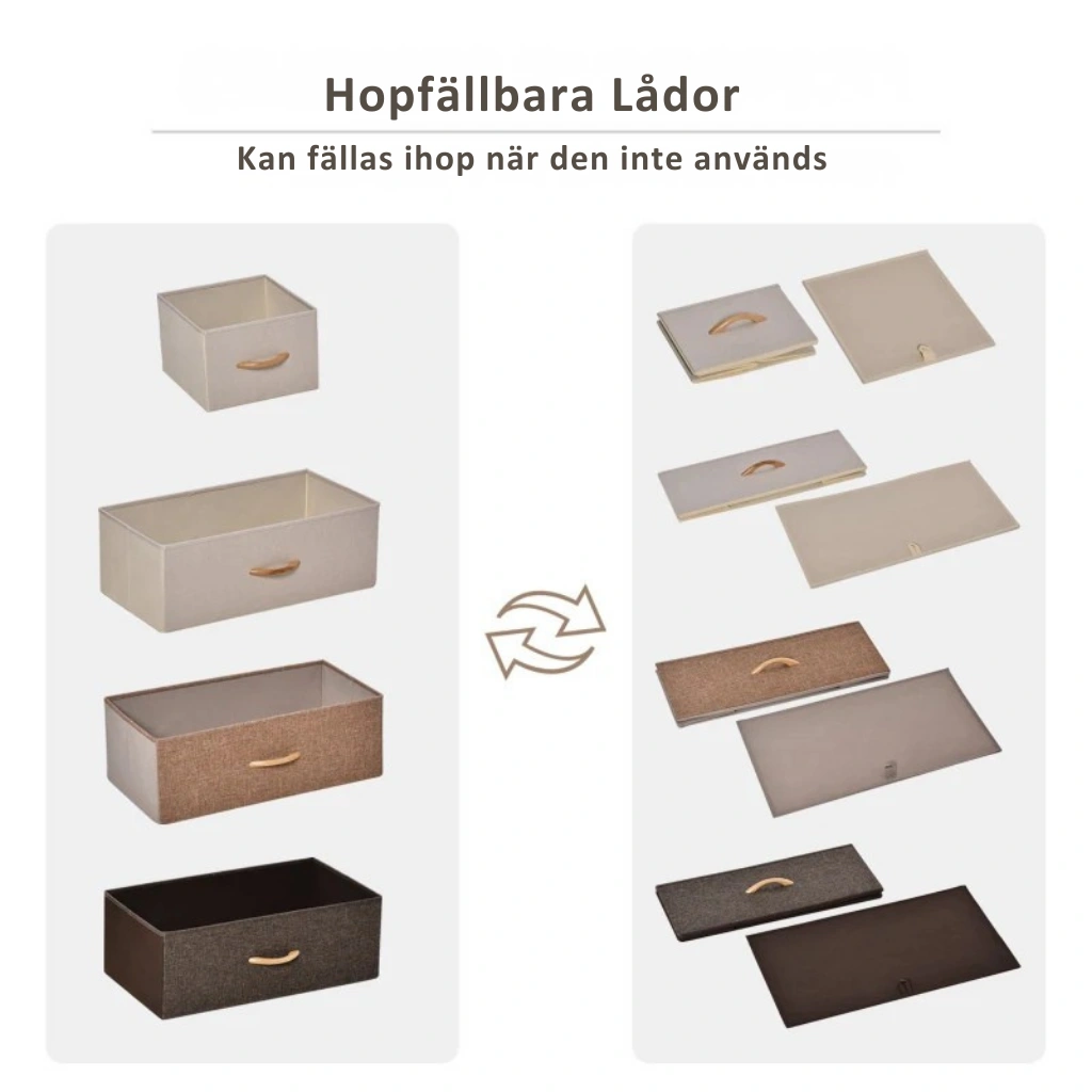• Fem djupa, vikbara tyglådor för flexibel och lättillgänglig förvaring