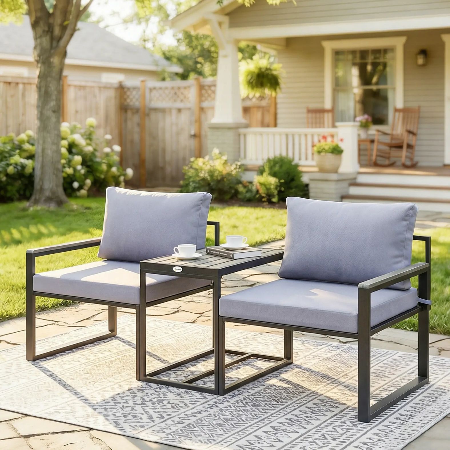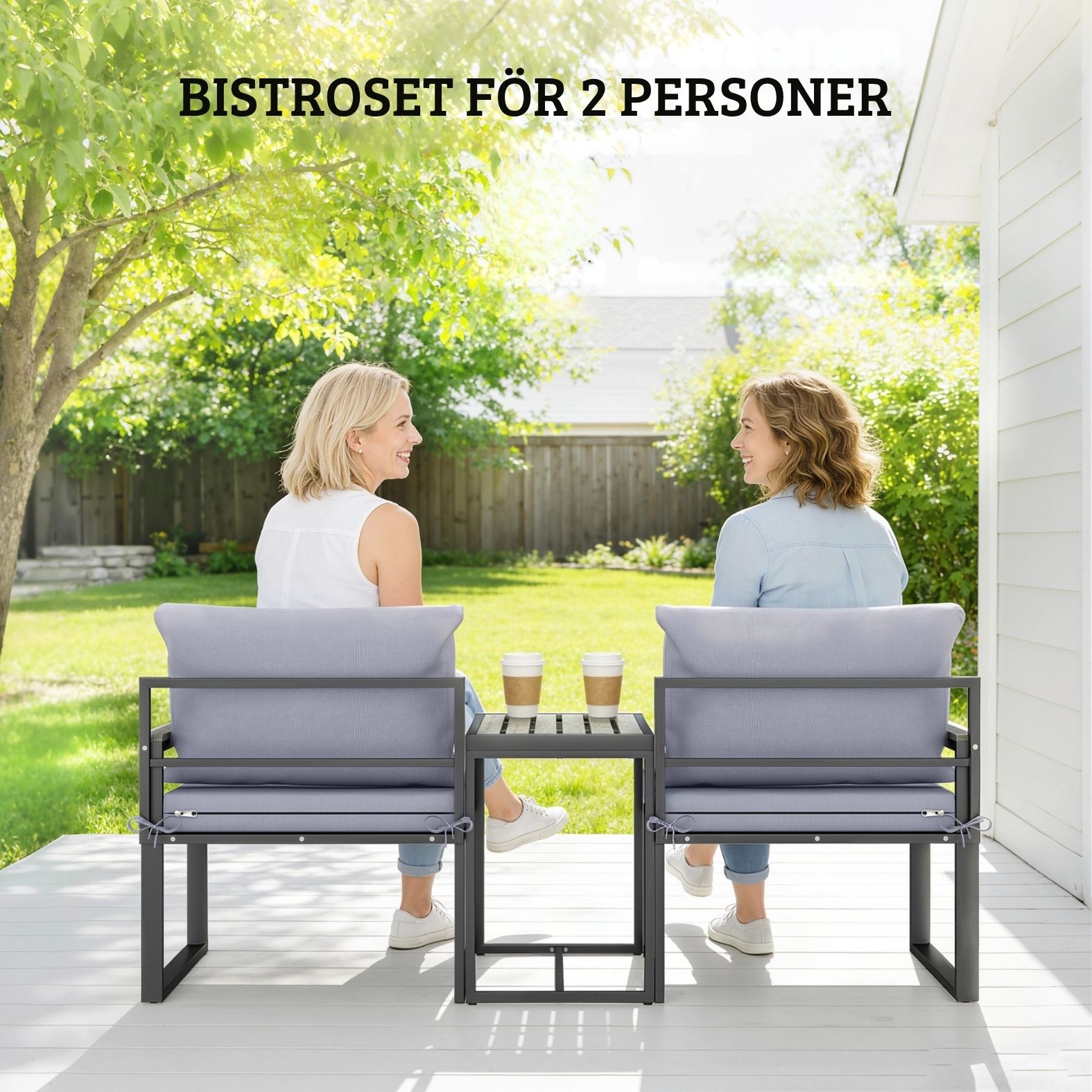 Med två bekväma fåtöljer och ett praktiskt sidobord får du en perfekt plats för kaffe, samtal och avkoppling utomhus.