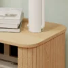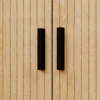 Den räfflade fronten ger möbeln karaktär och djup, samtidigt som skjutdörrarna sparar plats och skapar ett lugnt, harmoniskt uttryck. Den smala formen gör bordet perfekt vid sängen, men det fungerar lika bra som sidobord i vardagsrum eller hall.